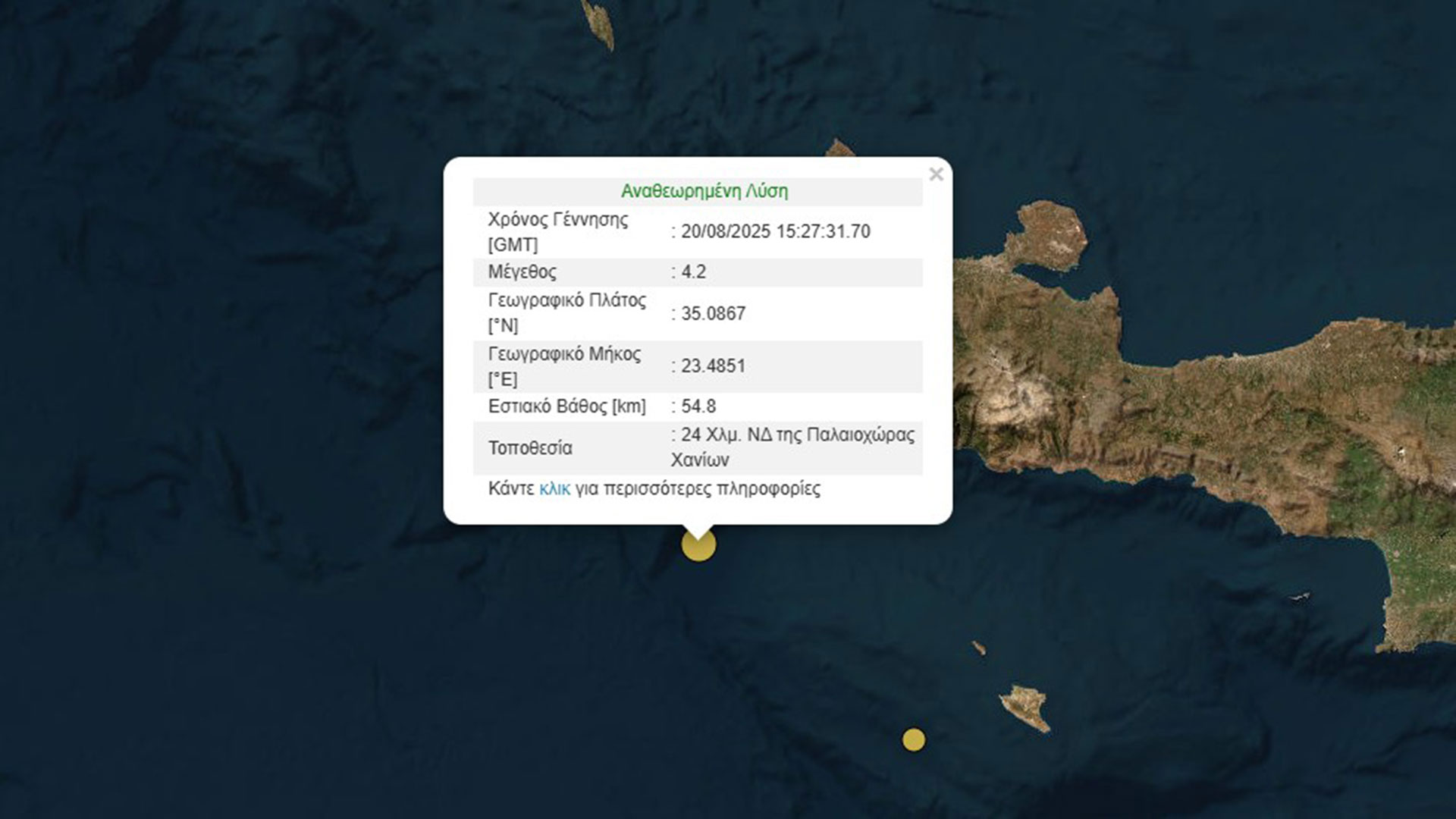 Σεισμός 4,2 βαθμών της κλίμακας Ρίχτερ σημειώθηκε το απόγευμα ανοιχτά της Παλαιόχωρας Χανίων.