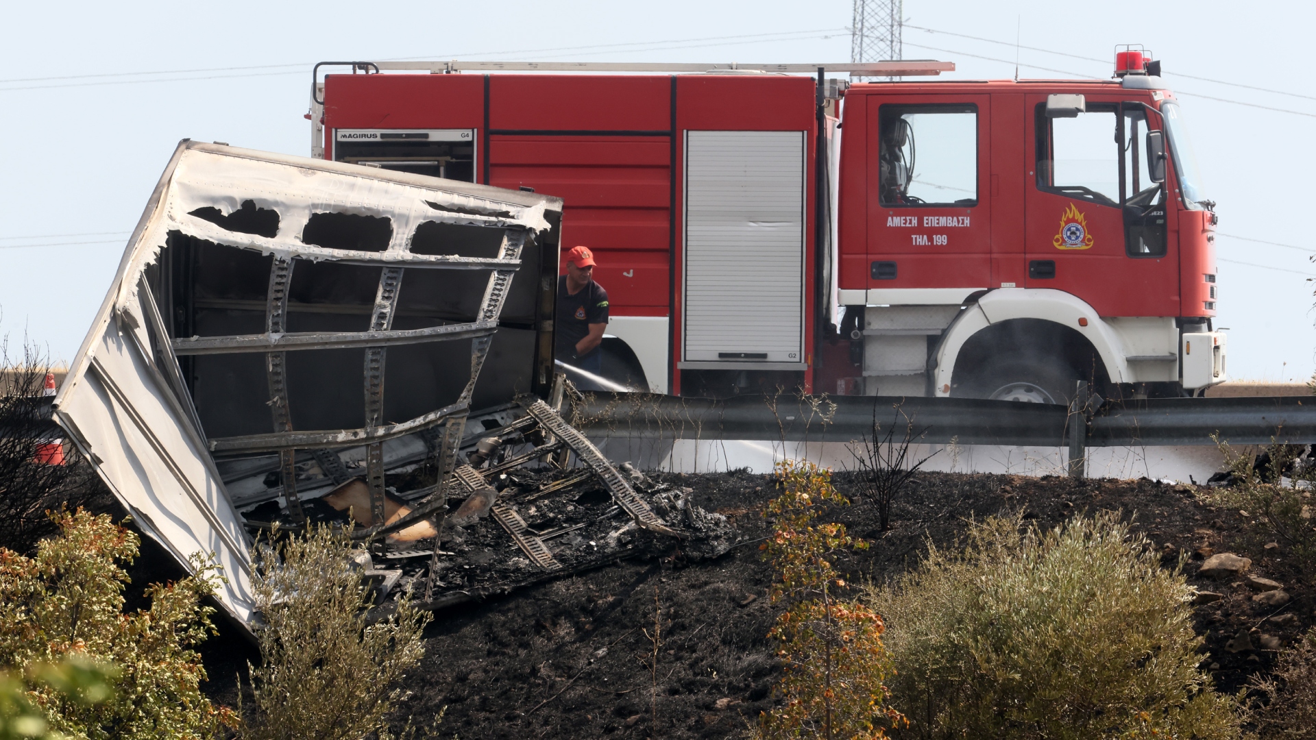 Το ημιφορτηγό, που ακολουθούσε πίσω του, προσέκρουσε με σφοδρότητα, με αποτέλεσμα να εκδηλωθεί φωτιά στο όχημα. Από την πρόσκρουση και την πυρκαγιά που ξέσπασε αμέσως τρεις άνθρωποι απανθρακώθηκαν, ενώ μία 49χρονη γυναίκα τραυματίστηκε σοβαρά.