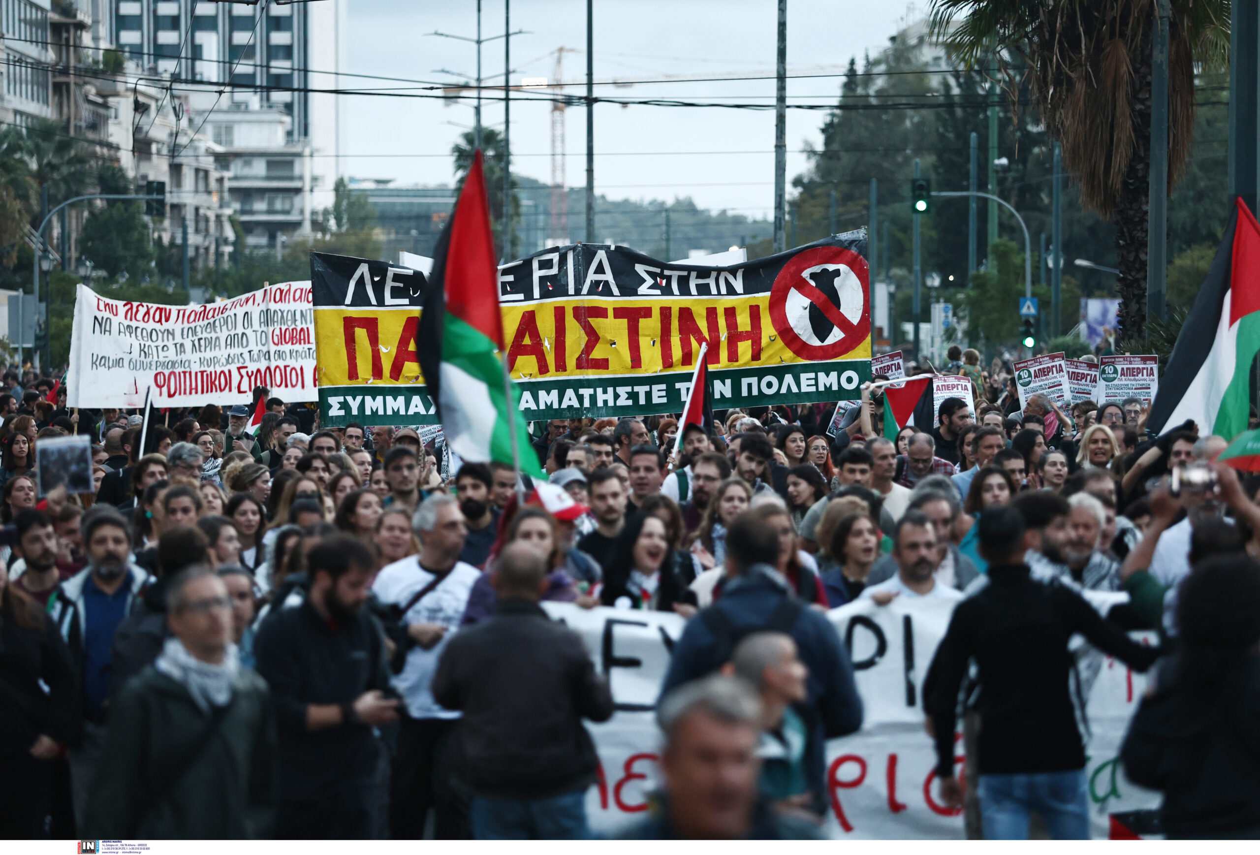 Πλήθος κόσμου συμμετέχει σε συγκέντρωση διαμαρτυρίας στο κέντρο της Αθήνας εκφράζοντας την αλληλεγγύη του στον παλαιστινιακό λαό. Αυτή την ώρα βρίσκεται σε εξέλιξη πορεία προς την πρεσβεία του Ισραήλ.