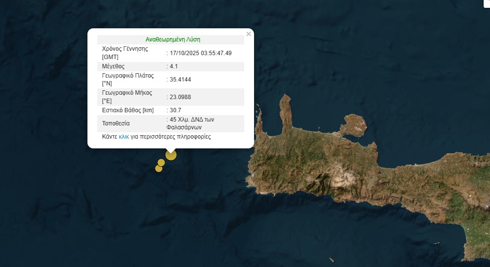 Σεισμική δόνηση 4,1 βαθμών της κλίμακας Ρίχτερ σημειώθηκε στις 06.55, σε απόσταση 290 χλμ. νότια της Αθήνας.