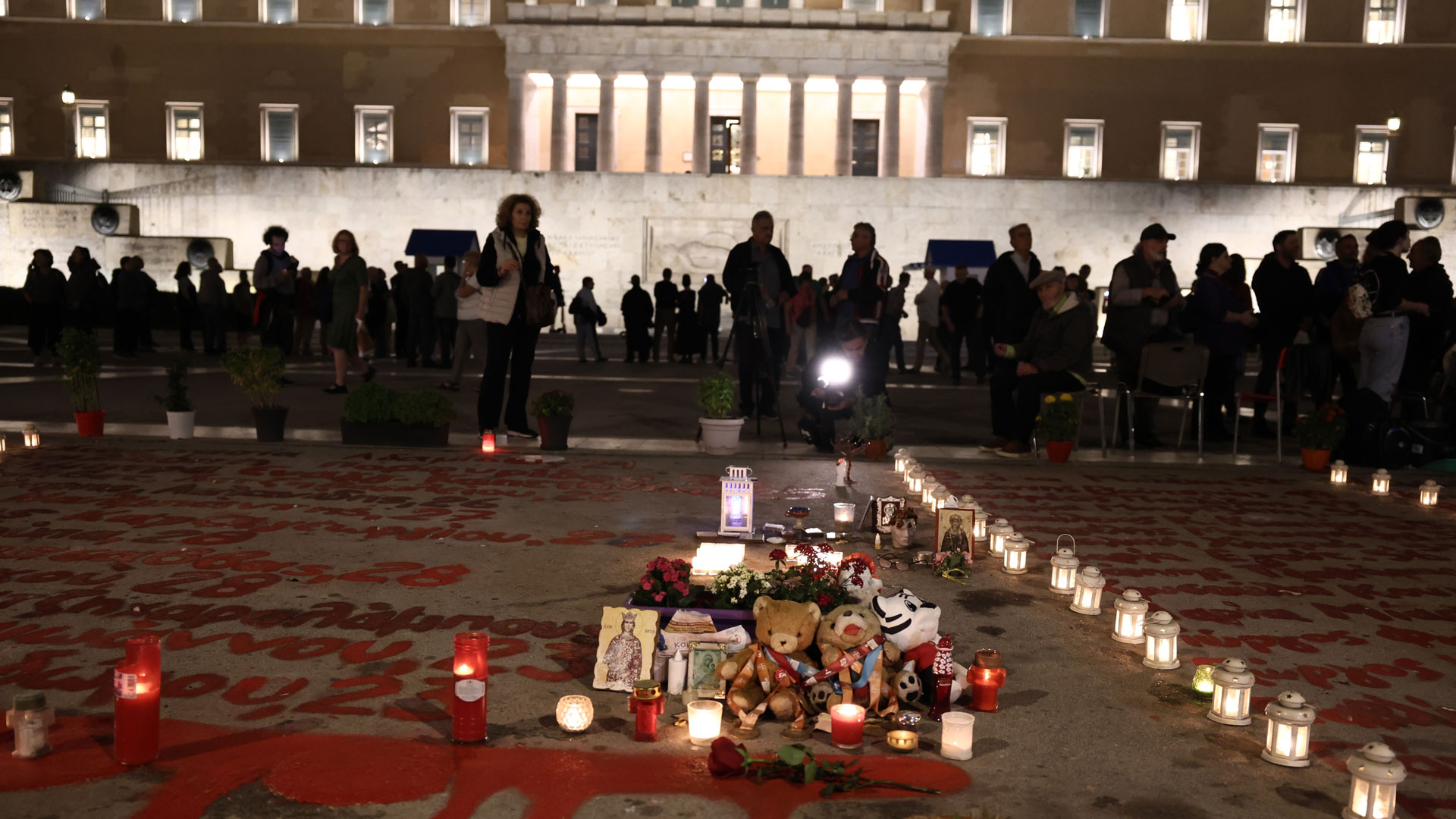 Πολίτες που έχουν φτάσει στην πλατεία μπροστά από το μνημείο άναψαν κεριά γύρω από τα ονόματα των θυμάτων της τραγωδίας των Τεμπών.