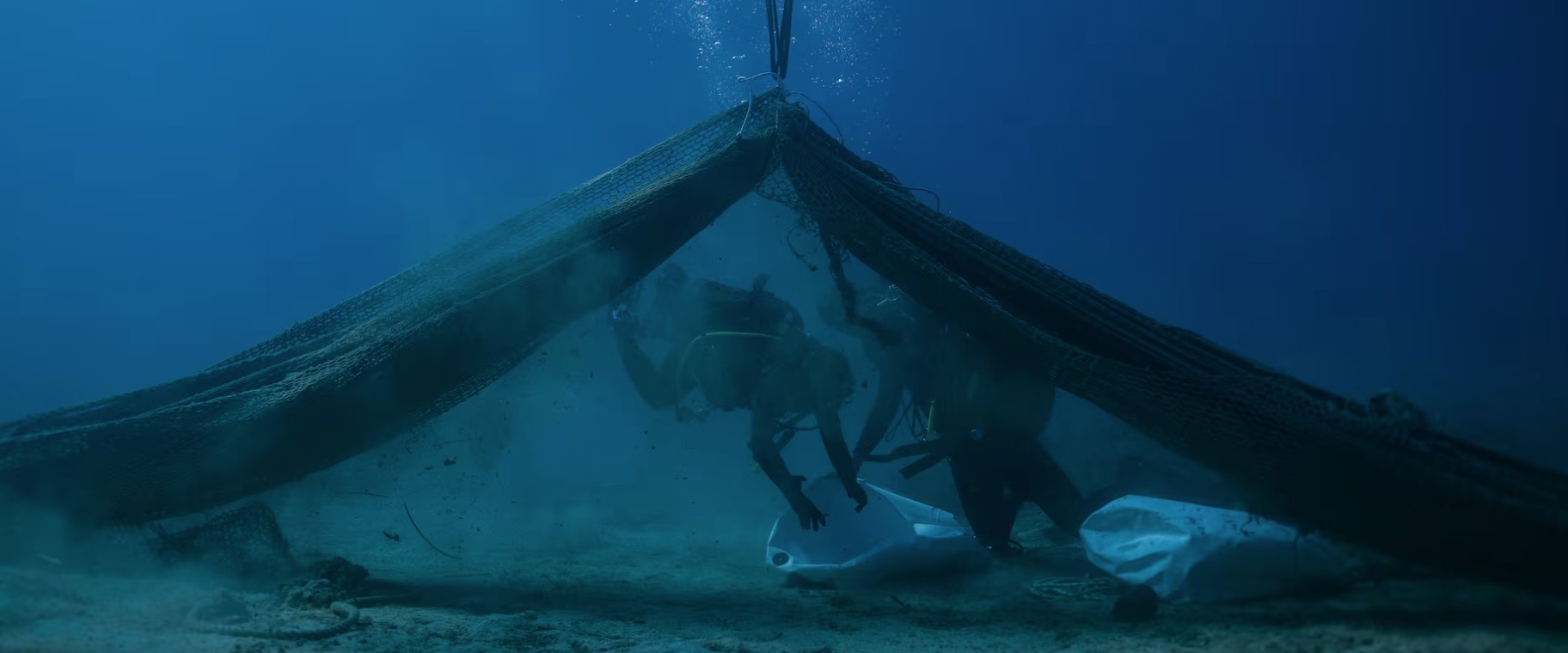 Εθελοντές δύτες χρησιμοποιούν ειδικές τεχνικές για να ανυψώσουν τα βαριά, μπερδεμένα δίχτυα από τον βυθό, ενώ εργάζονται με ακρίβεια και με αίσθηση επείγουσας ανάγκης.