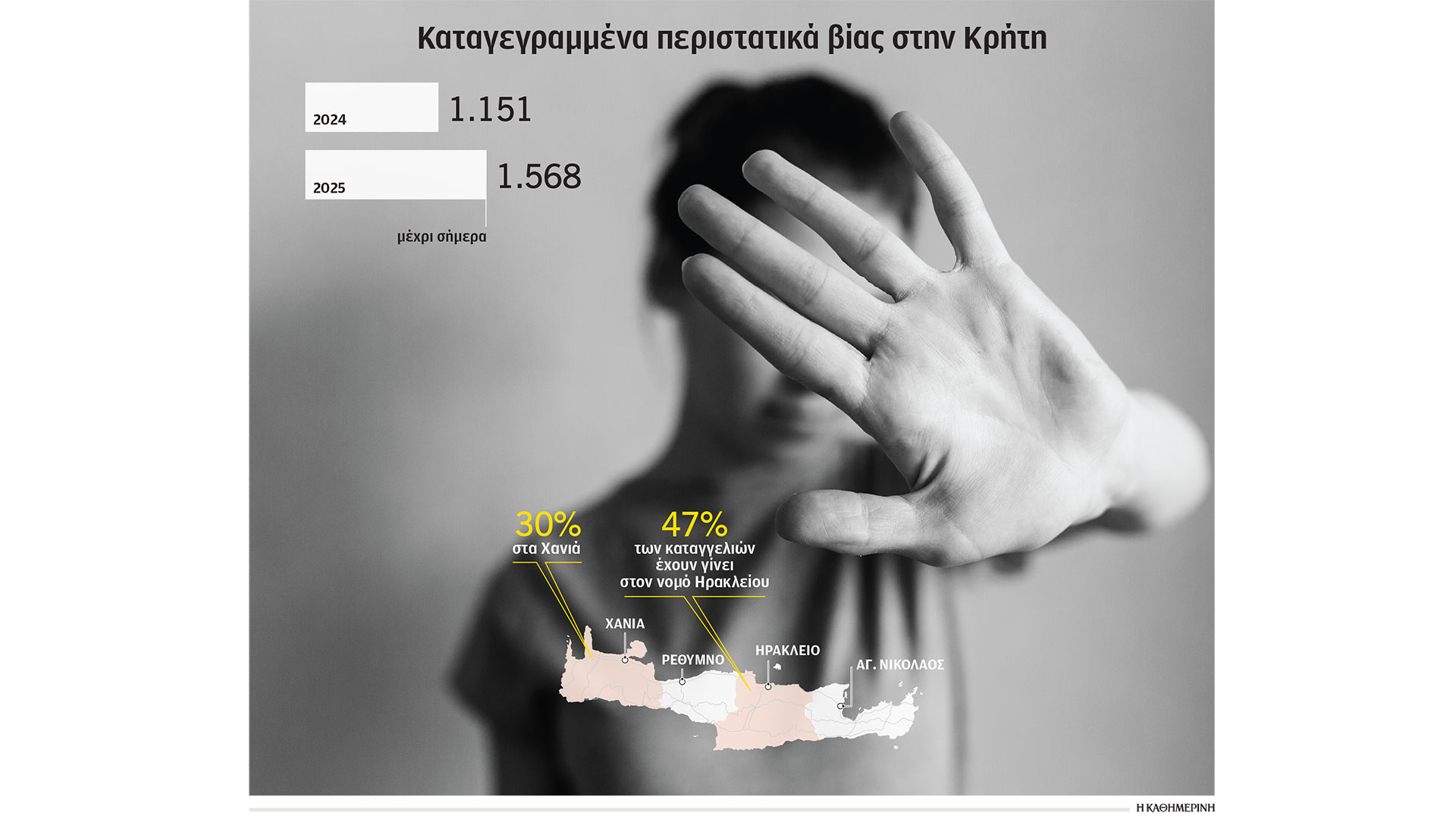 Σύμφωνα με την τέταρτη έκθεση του Παρατηρητηρίου για τη Βία κατά των Γυναικών στην Κρήτη, τα καταγεγραμμένα περιστατικά βίας το 2024 στο νησί ανήλθαν σε 1.151, ενώ ήδη φέτος έχουν φθάσει στα 1.568. Το Ηράκλειο εμφανίζει το μεγαλύτερο ποσοστό καταγγελιών, με 47%, με τα Χανιά να ακολουθούν με 30%. Χωρίς να γνωρίζουμε ακριβή νούμερα, προβληματισμό προκαλούν στους γνωρίζοντες στην Κρήτη και οι καταγγελίες σε ό,τι αφορά τη σεξουαλική παρενόχληση στους χώρους εργασίας, ιδίως τους θερινούς μήνες στους κλάδους της φιλοξενίας και της εστίασης.