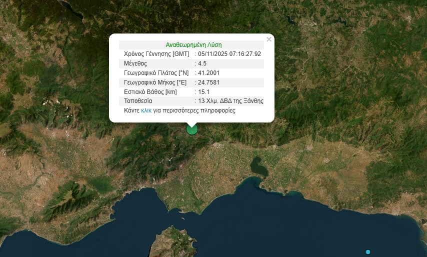 Σεισμός μεγέθους 4,5 Ρίχτερ σημειώθηκε στις 9:16 σήμερα, Τετάρτη, το πρωί στην περιοχή της Ξάνθης.