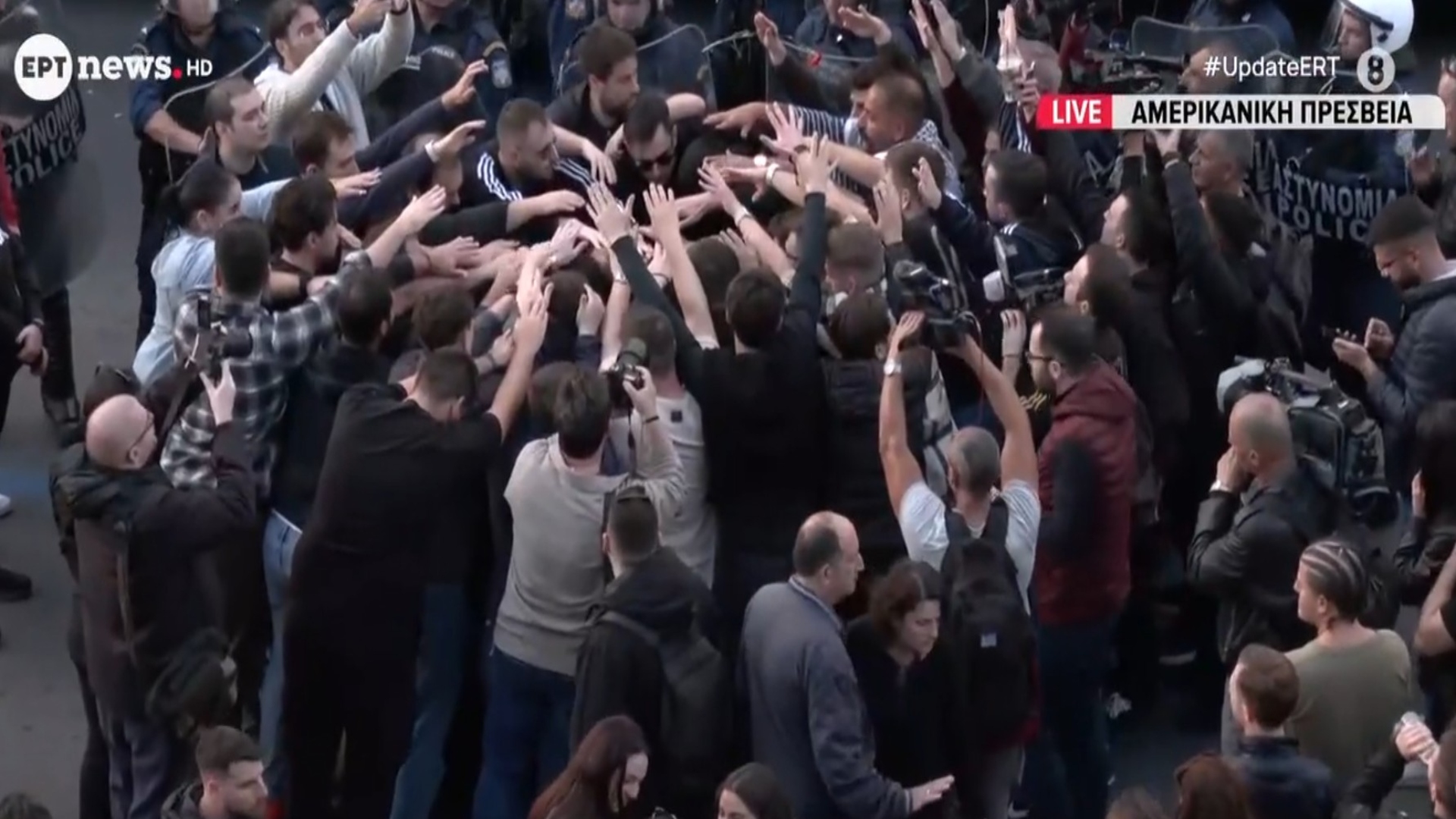 Η αιματοβαμμένη σημαία του Πολυτεχνείου, σύμβολο της εξέγερσης της 17ης Νοέμβρη, έφτασε λίγο μετά τις τέσσερις έξω από την αμερικανική πρεσβεία.