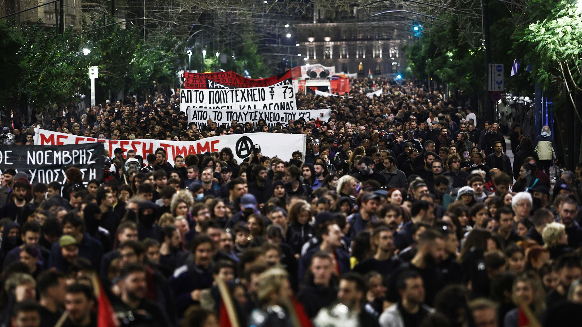 Στην κορυφή της πορείας βρέθηκαν φοιτητικοί σύλλογοι, οι οποίοι φώναζαν συνθήματα υπέρ της Παλαιστίνης, κατά των διαγραφών φοιτητών και υπενθύμιζαν τα διαχρονικά αιτήματα του Πολυτεχνείου για «Ψωμί – Παιδεία – Ελευθερία». Σύμφωνα με εκτιμήσεις, στην πορεία συμμετείχαν περίπου 23.000 πολίτες.