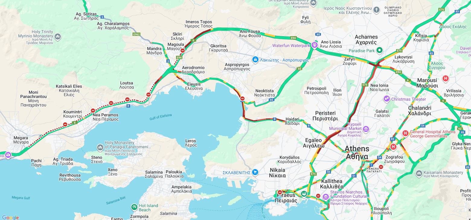 Η διακοπή κυκλοφορίας στην Αθηνών–Κορίνθου από τα διόδια της Ελευσίνας προς την Κόρινθο έχει επιτείνει τις δυσκολίες, προκαλώντες σημαντικές καθυστερήσεις.