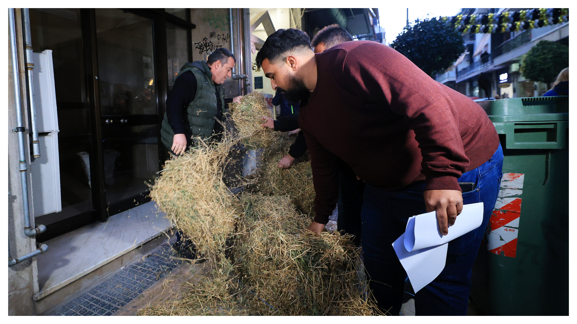 Αγρότες πέταξαν σανό έξω από γραφεία βουλευτών της Νέας Δημοκρατίας στη Λάρισα, το απόγευμα της Παρασκευής.