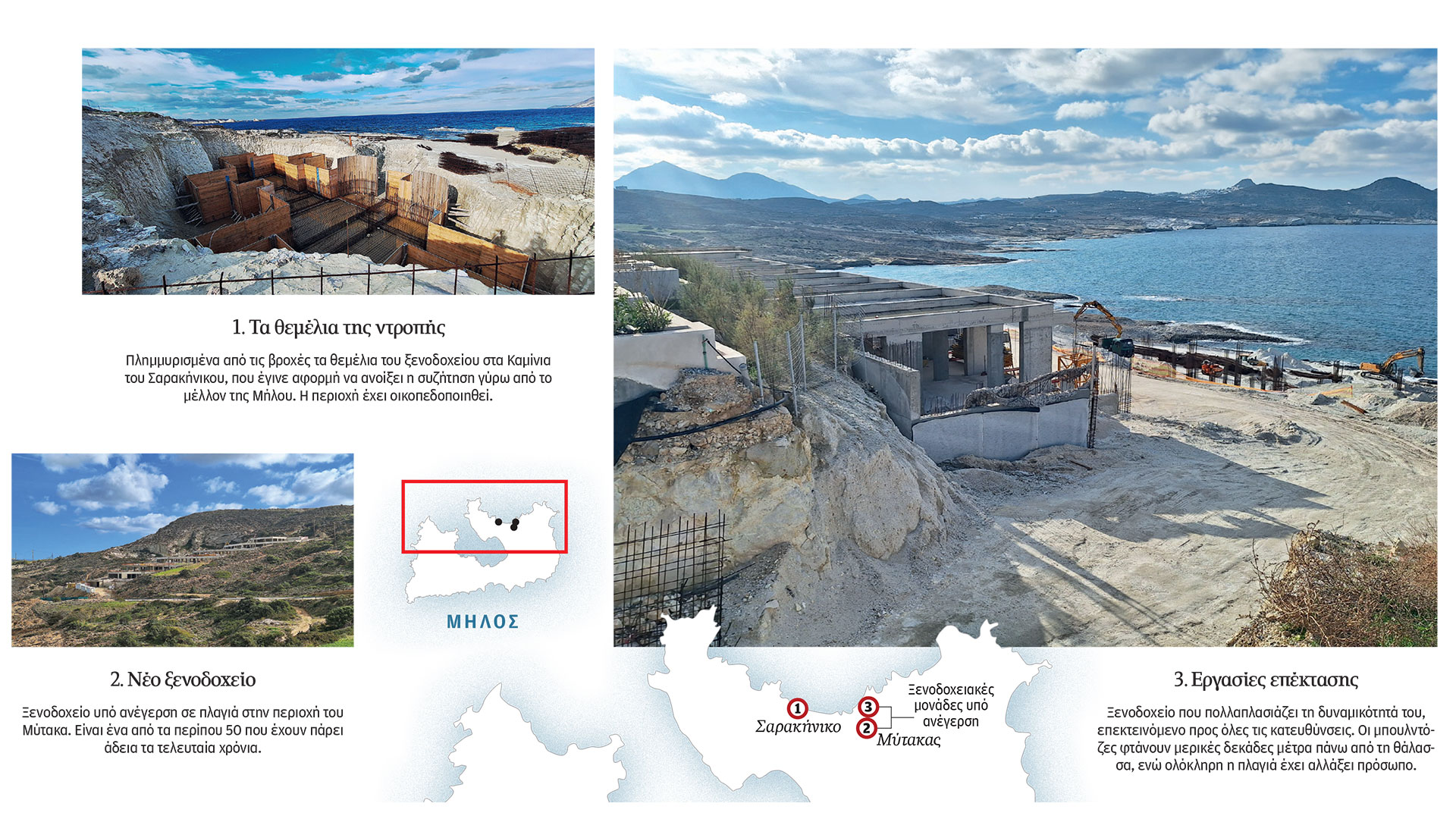 Η Μήλος χτίζεται με πρωτόγνωρους ρυθμούς. Οπου και αν βρεθείς στο νησί, θα δεις οικοδομές γεμάτες με εργάτες. Φορτηγά, μπετονιέρες, μπουλντόζες, αντλίες μπετόν πηγαινοέρχονται στους δρόμους. Τα μικρά ξενοδοχεία και τα ενοικιαζόμενα δωμάτια στον Αδάμαντα, το λιμάνι του νησιού, είναι γεμάτα με συνεργεία από την Αθήνα. «Από τότε που “έσκασε” το Σαρακήνικο, όλο το νησί είναι σε οικοδομικό οργασμό. Ολοι τρέχουν να προλάβουν να χτίσουν γιατί φοβούνται ότι θα “κοπούν” οι άδειες», εκτιμά ο Δημήτρης Μωραΐτης, πρόεδρος του συλλόγου των ξενοδόχων του νησιού. Η διαχείριση της υπόθεσης από το υπουργείο Περιβάλλοντος δείχνει ότι κάτι τέτοιο –δηλαδή η διακοπή της δόμησης και ο επανέλεγχος των οικοδομικών αδειών– είναι απίθανο να συμβεί.