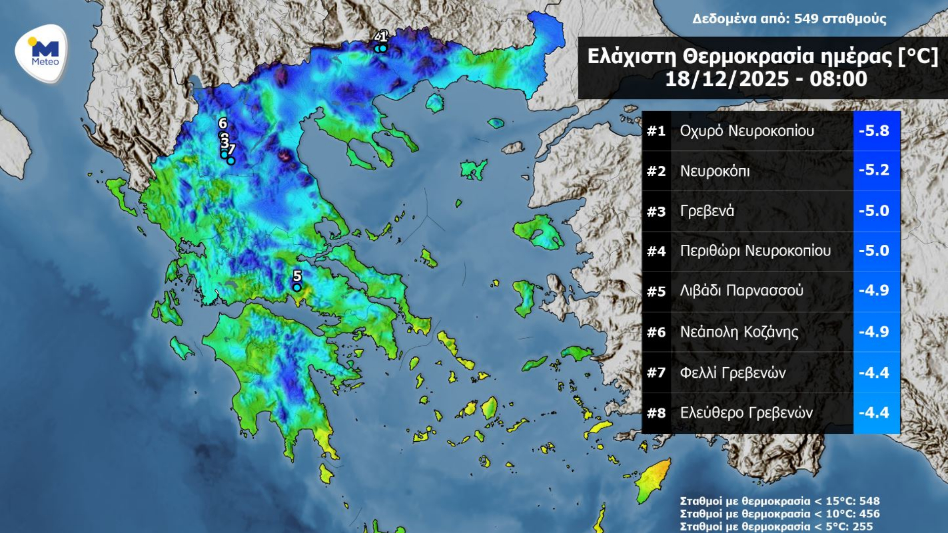 Στον χάρτη του Meteo που ακολουθεί παρουσιάζεται η κατανομή της ελάχιστης θερμοκρασίας στη χώρα καθώς και οι 8 σταθμοί με τις χαμηλότερες ελάχιστες το πρωί της Πέμπτης.