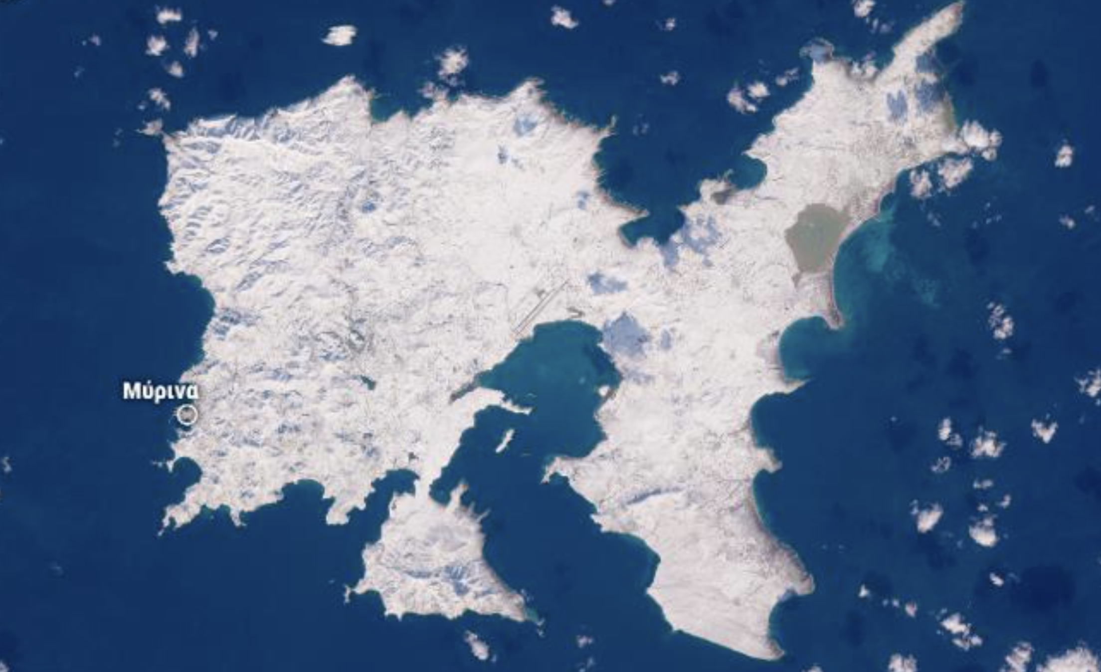 Η δορυφορική εικόνα, που ελήφθη από τον ευρωπαϊκό δορυφόρο Sentinel-2 το μεσημέρι της Πέμπτης, αποτυπώνει την εντυπωσιακή και ασυνήθιστη εικόνα της πάλλευκης Λήμνου.