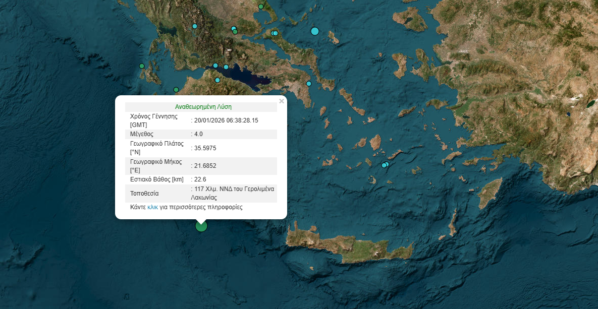 Σύμφωνα με το Γεωδυναμικό Ινστιτούτο του Εθνικού Αστεροσκοπείου Αθηνών, το επίκεντρο της δόνησης εντοπίζεται στον θαλάσσιο χώρο 117 χλμ. νότια- νοτιοδυτικά του Γερολιμένα Λακωνίας.