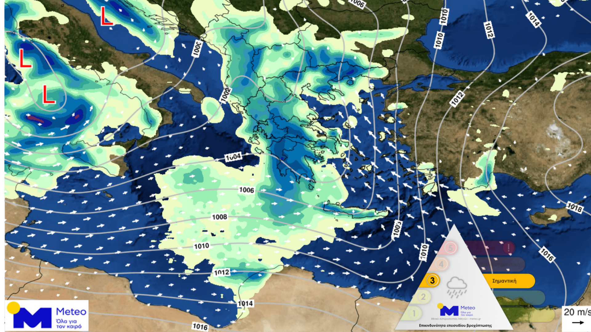 Τα φαινόμενα θα είναι τοπικά έντονα και κατά τόπους θα συνοδεύονται από χαλαζοπτώσεις σε νησιωτικά τμήματα του Νότιου και Ανατολικού Αιγαίου και πιθανόν σε περιοχές της Βορειοανατολικής Πελοποννήσου και της Νότιας Αττικής.