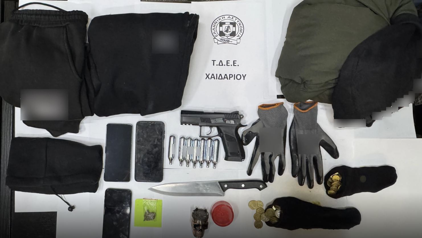 Οπως επισημαίνεται στη σχετική ανακοίνωση, ενδεικτικό της θρασύτητας της δράσης τους αποτελεί το γεγονός ότι είχαν αποκρύψει αεροβόλο πιστόλι, μαχαίρι και γάντια που είχαν χρησιμοποιήσει στις εγκληματικές τους πράξεις σε θαμνώδες σημείο στον προαύλιο χώρο σχολικού κτιρίου στο Χαϊδάρι.