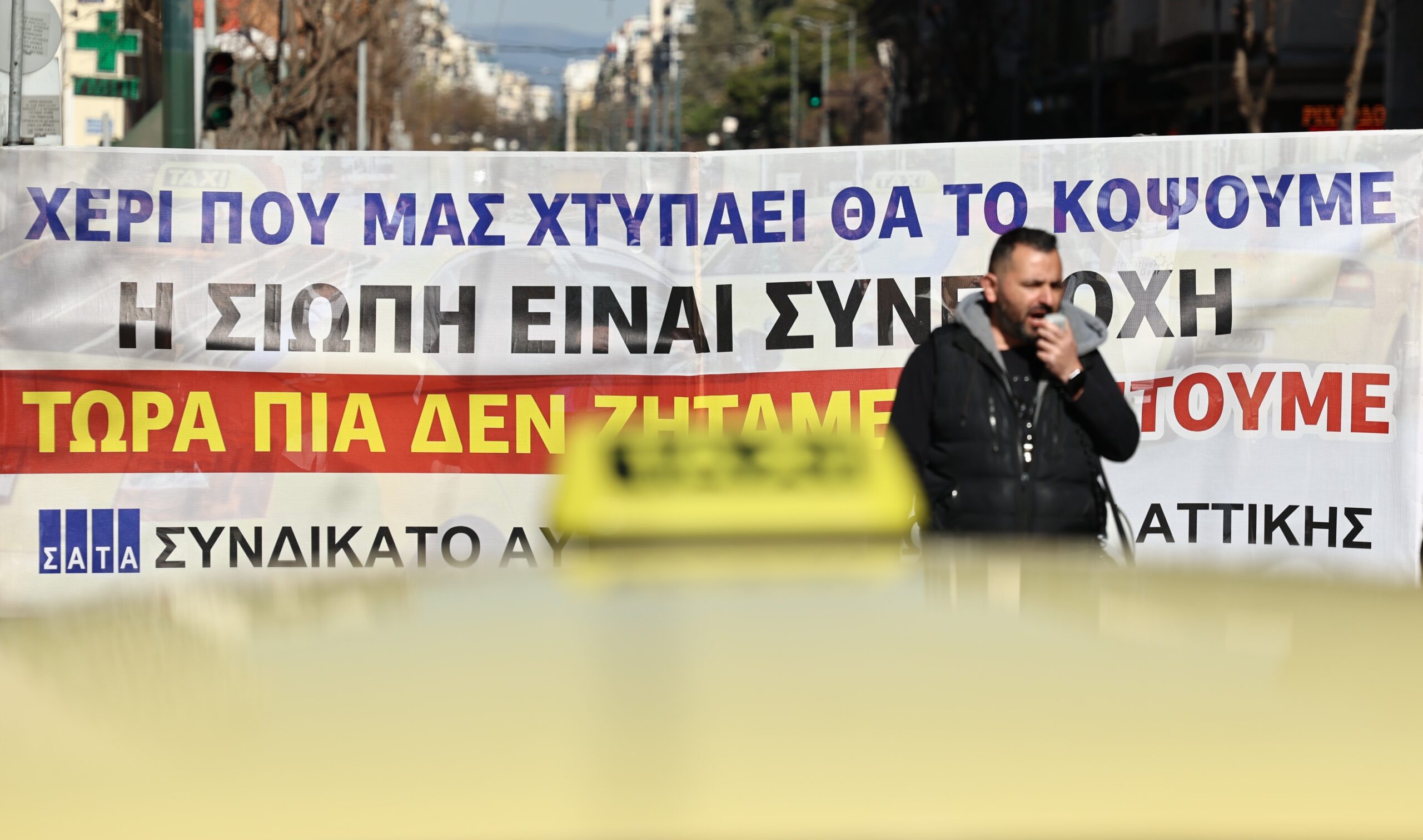 Πορεία από τα γραφεία του συνδικάτου προς το Μέγαρο Μαξίμου πραγματοποιούν οι ιδιοκτήτες ταξί, διαμαρτυρόμενοι, μεταξύ άλλων, για την υποχρεωτική μετάβαση στην ηλεκτροκίνηση που προωθεί το υπουργείο Μεταφορών.