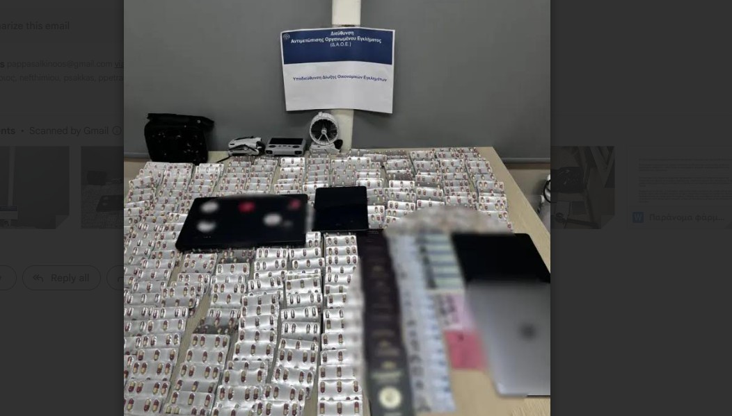 Κατά την έρευνα που πραγματοποιήθηκε σε οικία στην Αθήνα και σε φαρμακείο, οι Αρχές εντόπισαν περίπου 9.600 φαρμακευτικά δισκία, 36 πιστοποιητικά έγγραφα (ταυτότητες, διαβατήρια και διπλώματα οδήγησης) από τη Γαλλία και τη Γουινέα, έξι ηλεκτρονικούς υπολογιστές και τρία μη επανδρωμένα αεροσκάφη (drones).