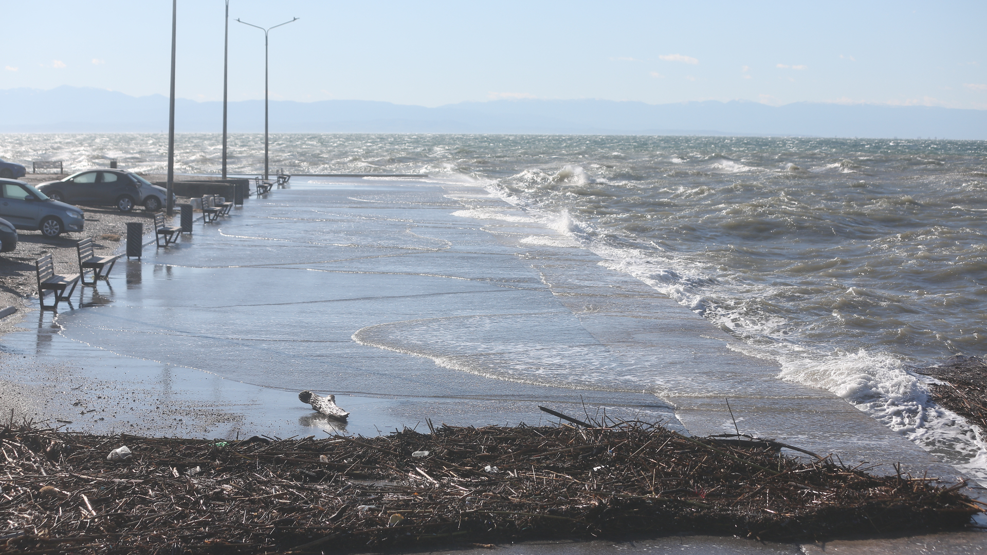 Μεγάλα κύματα έπληξαν και την Αγία Τριάδα Θεσσαλονίκης, όπου το νερό κάλυψε τμήμα της στεριάς, δημιουργώντας προβλήματα σε κατοίκους και καταστηματάρχες.