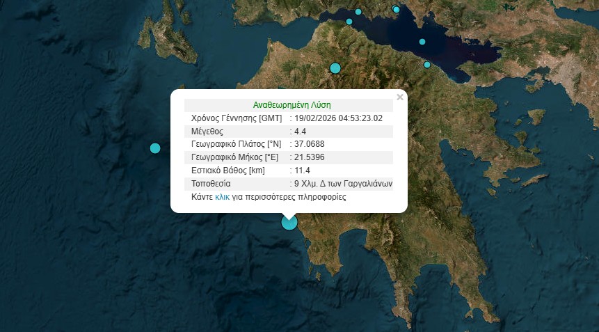Σεισμός μεγέθους 4,4 βαθμών της κλίμακας Ρίχτερ σημειώθηκε σήμερα, Πέμπτη, το πρωί (19/2) στη Μεσσηνία.