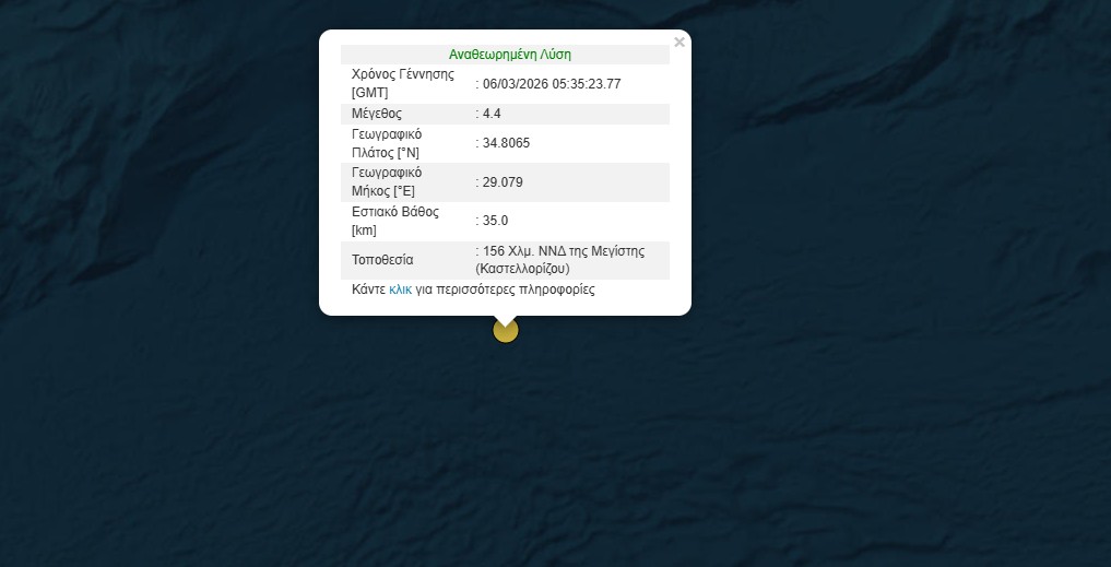 Σεισμική δόνηση 4,4 βαθμών της κλίμακας Ρίχτερ σημειώθηκε στις 07.35 το πρωί σήμερα, Παρασκευή, στο Καστελλόριζο.