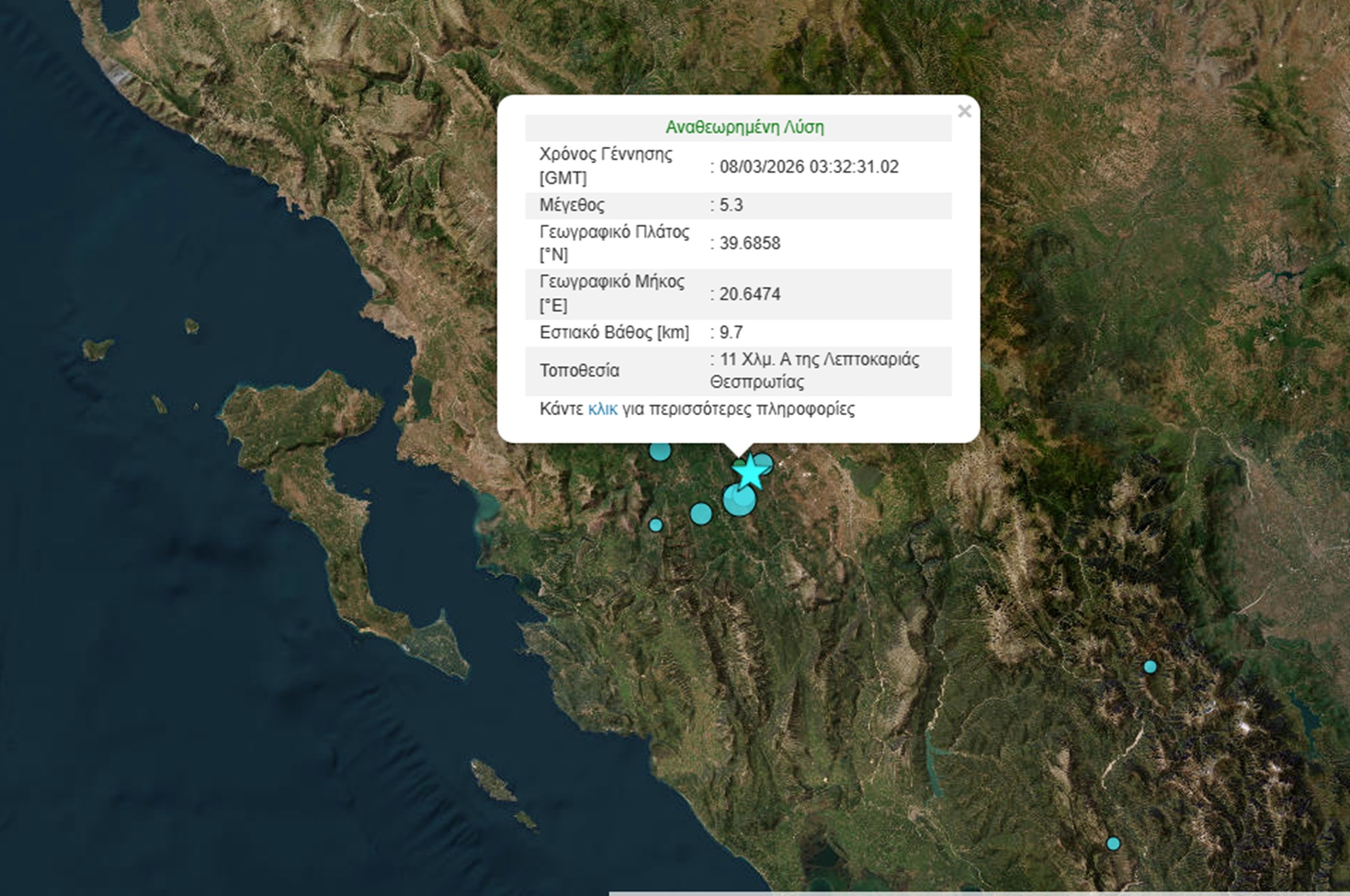 Σεισμική δόνηση μεγέθους 5,3 βαθμών της κλίμακα Ρίχτερ σημειώθηκε στις 05:32 στη Θεσπρωτία, όπως ανακοίνωσε το Γεωδυναμικό Ινστιτούτο του Εθνικού Αστεροσκοπείου Αθηνών εκ μέρους των τεσσάρων φορέων συγκρότησης του Ενιαίου Εθνικού Σεισμολογικού Δικτύου.