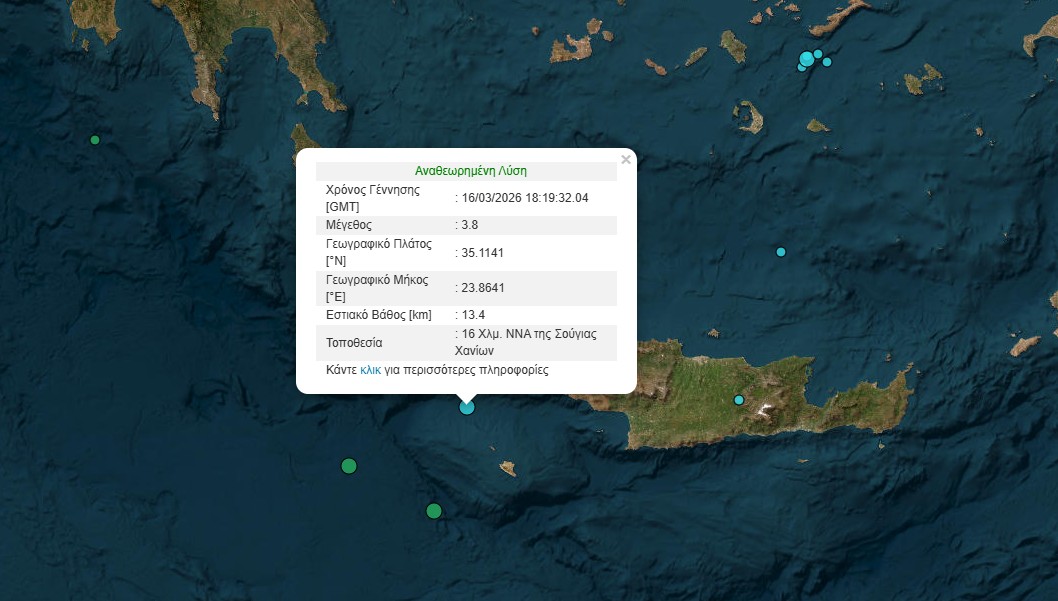Σεισμική δόνηση μεγέθους 3,8 Ρίχτερ σημειώθηκε το απόγευμα της Δευτέρας στη θαλάσσια περιοχή νότια της Κρήτης.