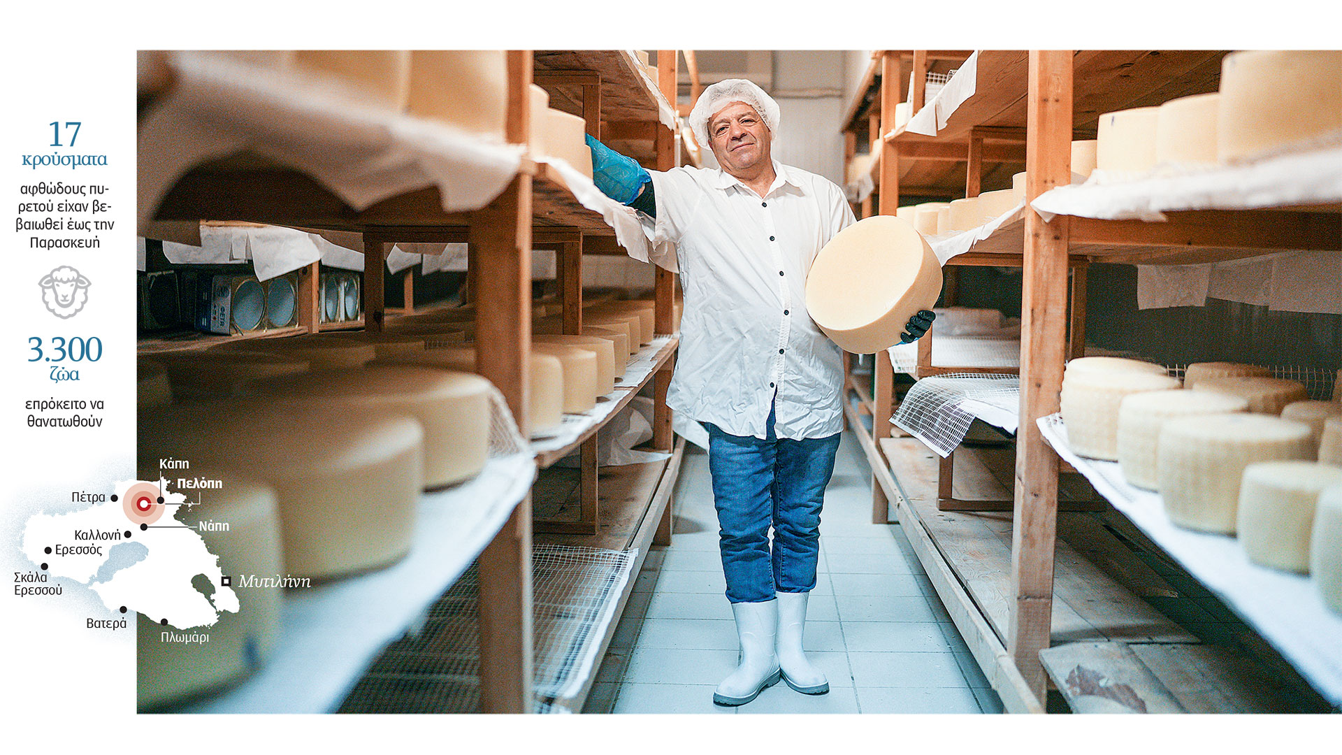 Ενα από τα παλαιότερα τυροκομεία του νησιού είναι του Παναγιώτη Ταστάνη στο χωριό Αγρα. Η σκέψη του τις τελευταίες μέρες είναι στους κτηνοτρόφους, τους μετρημένους προμηθευτές του, όπως λέει, που γνωρίζει καλά για δεκαετίες. «Τα τυριά μας παραμένουν στα ψυγεία και στα ξηραντήρια», είπε στην «Κ». Στη μονάδα του παράγεται με παραδοσιακό τρόπο ΠΟΠ φέτα και λαδοτύρι κι επίσης γραβιέρα. Το 80% της φέτας του κ. Ταστάνη εξάγεται στην Αμερική, όμως τώρα το περίφημο εμπόρευμα θα πρέπει να περιμένει. «Απαγορεύεται να πουλήσουμε ακόμη και τυριά που ωρίμαζαν για μήνες στη μονάδα. Δεν ξέρω αν αυτό έχει λογική, πάντως ολόκληρη η αγορά κάνει ένα βήμα πίσω», ανέφερε.