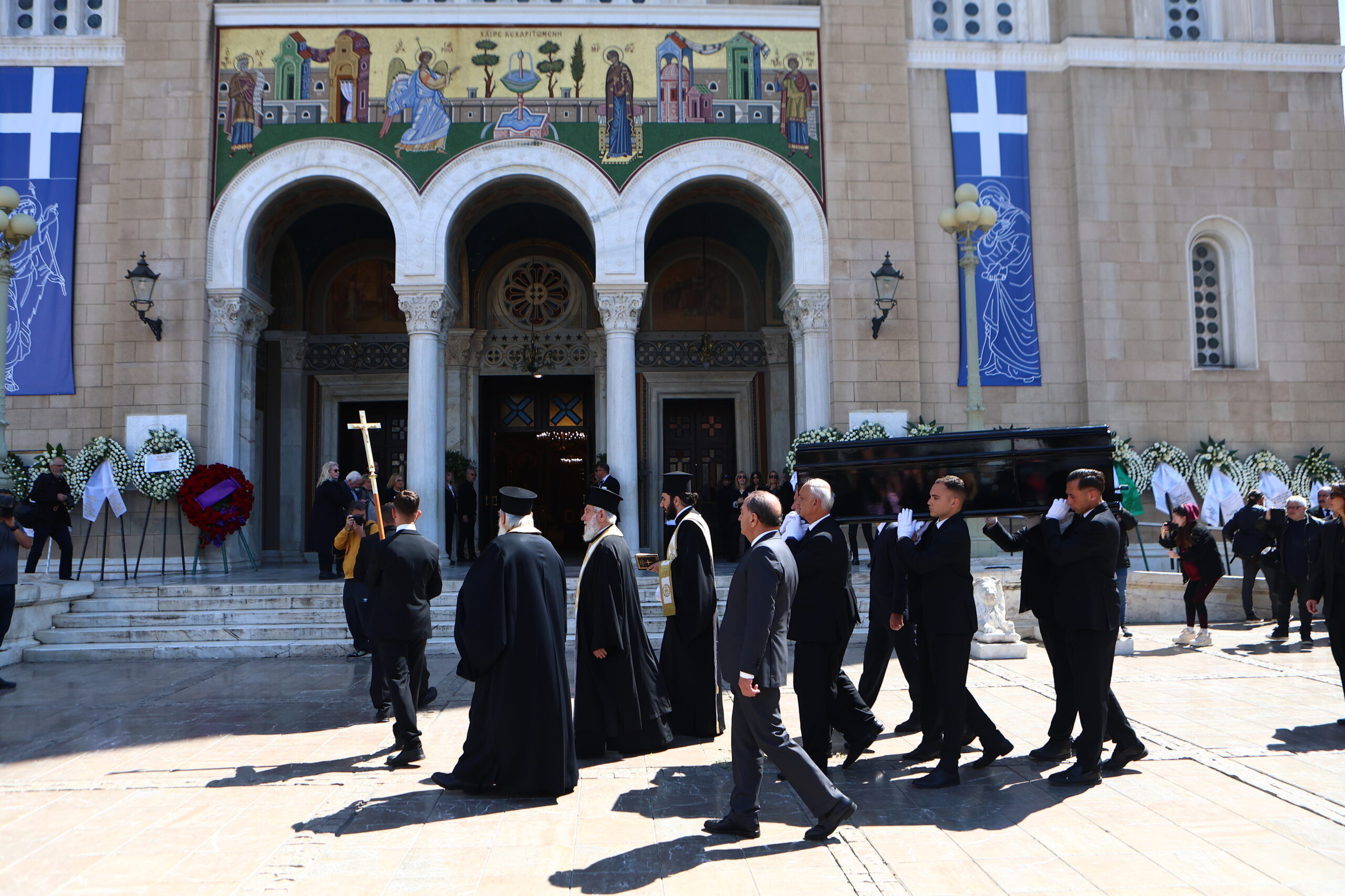 Η εξόδιος ακολουθία ξεκίνησε στις 14:00 στη Μητρόπολη Αθηνών, αμέσως μετά την ολοκλήρωση του λαϊκού προσκυνήματος στο παρεκκλήσι του Αγίου Ελευθερίου, όπου από νωρίς το πρωί χιλιάδες πολίτες συνέρρευσαν για να αποτίσουν τον ύστατο φόρο τιμής. Μπροστά στο φέρετρο στέκονταν η αδελφή της, η κόρη της Τζωρτίνα και τα εγγόνια της Μελίνα και Δημήτρης.