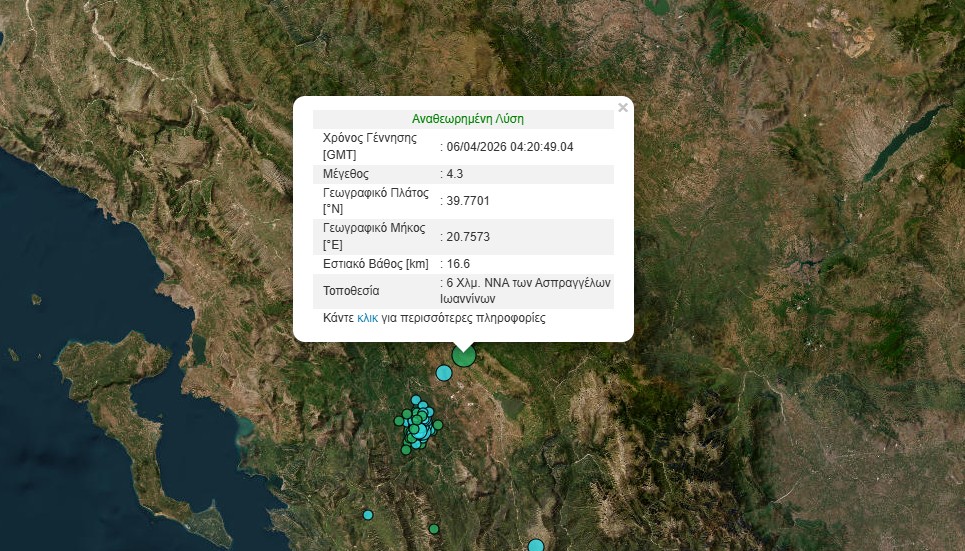 Σεισμός μεγέθους 4,3 Ρίχτερ σημειώθηκε, το πρωί της Μεγάλης Δευτέρας, 6 χιλιόμετρα νότια-νοτιοανατολικά των Ασπραγγέλων Ιωαννίνων.