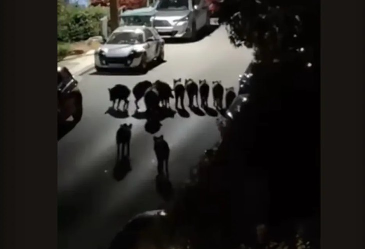 Αντίστοιχα, όπως αποτυπώνεται σε βίντεο που τράβηξε κάτοικος της περιοχής, αγριογούρουνα έκαναν την εμφάνισή τους έξω και από σπίτια και δίπλα σε σταθμευμένα οχήματα σε δρόμο στο Πανόραμα, το βράδυ της Μεγάλης Δευτέρας.