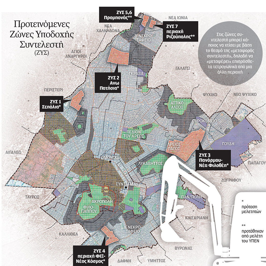 Πιο συγκεκριμένα, το υπουργείο Περιβάλλοντος ζήτησε να οριστούν ως ζώνες υποδοχής συντελεστή οι περιοχές της πλατείας Χαλεπά στην Κυπριάδου (οδηγώντας σε αύξηση συντελεστή από 1,60 σε 2), Νέας Φιλοθέης πάνω από την Πανόρμου (Σ.Δ. από 1,20 σε 2), λόφου Σκουζέ (από 2,10 σε 2,40), Ριζούπολης (από 1,60 σε 2) και σε δύο σημεία στον Προμπονά (από 0,80 σε 1,20). Οι μελετητές υπέβαλαν αντιπρόταση: Προτείνουν στις περιοχές που θα καθοριστούν ως ζώνες υποδοχής συντελεστή να προηγηθεί μια μείωση του επιτρεπόμενου συντελεστή δόμησης, ώστε με την προσθήκη της νέας δόμησης να «ισοφαριστεί». Με άλλα λόγια, προτείνουν στις περιοχές αυτές να μειωθεί το πόσο μπορείς να χτίσεις, ώστε να έρθει στα σημερινά όρια με την προσθήκη των επιπλέον τετραγωνικών από τη μεταφορά συντελεστή (άρα να μην υπάρξει πολεοδομική επιβάρυνση). Οι περιοχές στις οποίες πρότειναν να γίνει αυτό είναι οι περιοχές Προμπονά, Ριζούπολης, Σεπολίων και των σταθμών μετρό Φιξ (πλευρά Νέου Κόσμου), Πανόρμου (Νέα Φιλοθέη) – Αμπελοκήπων. «Αιτιολογούμε στο ΥΠΕΝ την πρότασή μας και ελπίζουμε να γίνει δεκτή», αναφέρει ο κ. Λαλένης.
