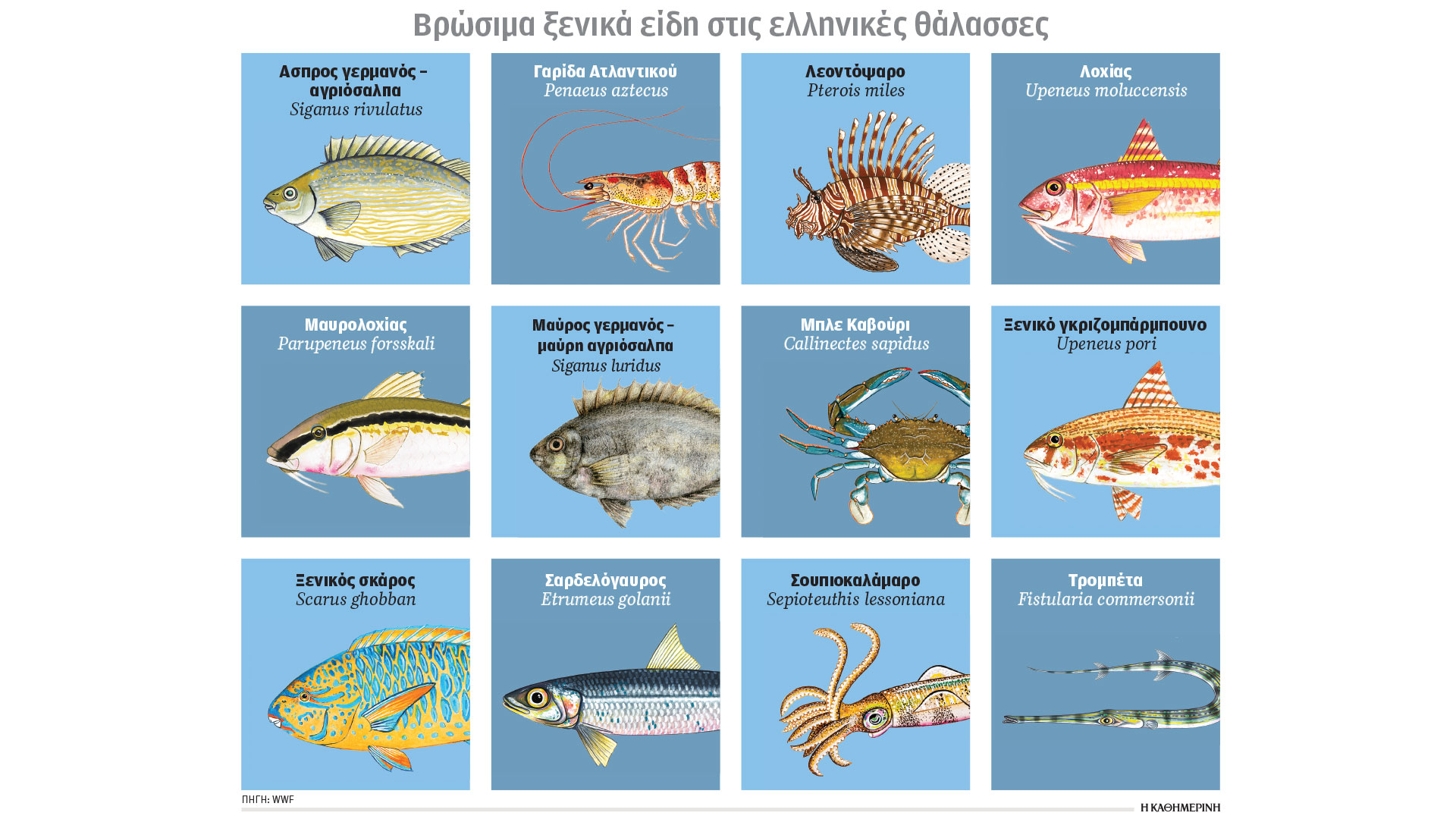 Τα ξενικά είδη δεν βρίσκονται σε όλη την επικράτεια στις ίδιες ποσότητες. Οσο πιο βόρεια πάμε, είναι λιγότερα ή διαφέρουν. «Κάποιοι τρώνε ξενικά ψάρια και δεν το γνωρίζουν. Για παράδειγμα, ο “γαύρος ο παριανός”. Αν πάτε στη Βαρβάκειο θα τον βρείτε. Οι περισσότεροι νομίζουν ότι είναι γαύρος από την Πάρο. Στην πραγματικότητα, είναι ξενικό είδος, απλώς χρησιμοποιείται ένα πιο “πιασάρικο” τοπωνύμιο», εξηγεί ο κ. Μαργαρίτης. «Για μένα η πρόκληση είναι πώς ένα περιβαλλοντικό πρόβλημα μπορεί να μετατραπεί σε οικονομική ευκαιρία. Για να συμβεί αυτό, χρειάζεται εκπαίδευση, τόσο για τον καταναλωτή όσο και για τον επαγγελματία», προτείνει η Γιώτα Σωτηροπούλου, βιολόγος και συνεργάτις του WWF Ελλάς.