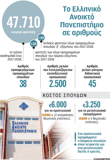 Το Ελληνικό Ανοικτό Πανεπιστήμιο (ΕΑΠ) είναι, στην πράξη, το πρώτο «ιδιωτικό» πανεπιστήμιο, με επικεφαλής το υπουργείο Παιδείας, δηλαδή το ελληνικό Δημόσιο. Τα τελευταία χρόνια το ΕΑΠ καταγράφει εντυπωσιακή άνοδο του αριθμού των προγραμμάτων του και των φοιτητών του –σχεδόν θα τους διπλασιάσει κατά το τρέχον πρώτο ακαδημαϊκό έτος σε σχέση με όσους σπούδαζαν πέρυσι στο πρώτο έτος–, ενώ σχεδιάζει νέα προγράμματα από τον Οκτώβριο του 2018. Αποδεικνύεται, έτσι, ανταγωνιστικό ακόμη και απέναντι στα δημόσια «συμβατικά» πανεπιστήμια και ΤΕΙ της χώρας μας.