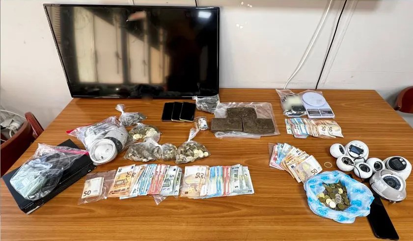 Επιπλέον, βρέθηκαν και κατασχέθηκαν, 7 Ι.Χ.Ε. αυτοκίνητα, καταγραφικό μηχάνημα εικόνας, τηλεόραση, 10 κάμερες, ζυγαριά ακριβείας, 12 κινητά τηλέφωνα, καθώς και 6.531 ευρώ.