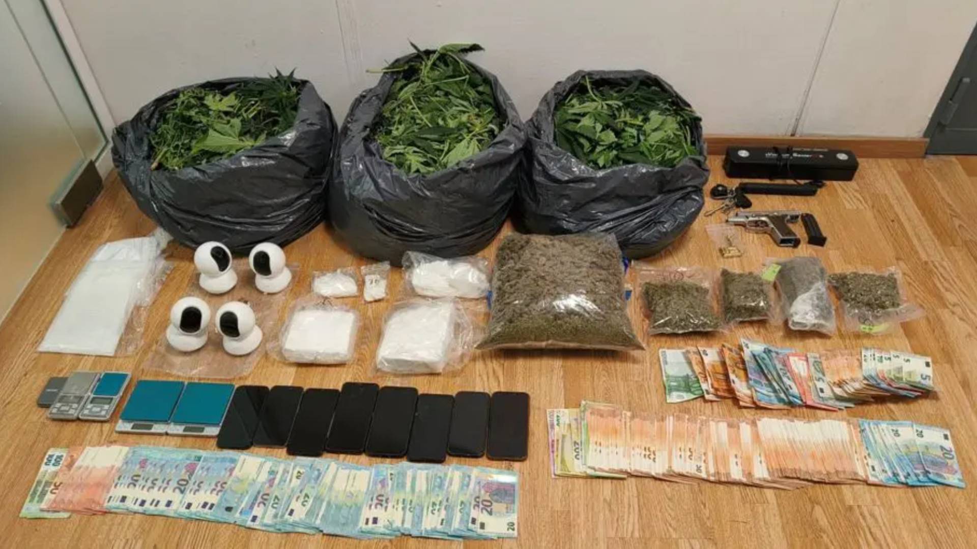 Συνολικά, από τις σωματικές έρευνες, καθώς και τις έρευνες που πραγματοποιήθηκαν στο οίκημα με την καλλιέργεια, τις οικίες των συλληφθέντων, καθώς και στην ειδική κρύπτη του οχήματος, βρέθηκαν και κατασχέθηκαν: