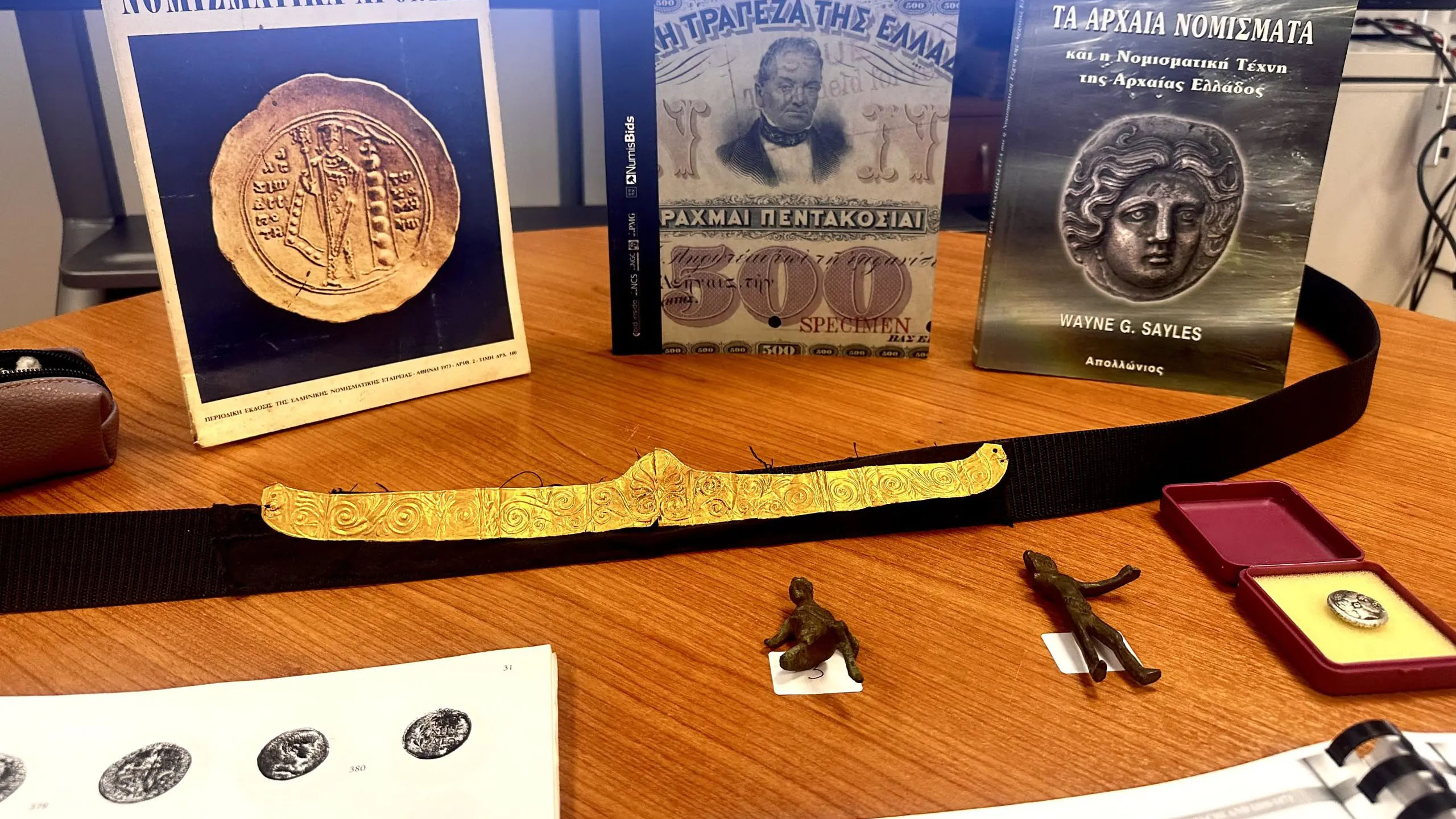 - δύο βιβλία και δύο βιβλιοδεσίες που εμφαίνονται τύποι αρχαίων νομισμάτων και