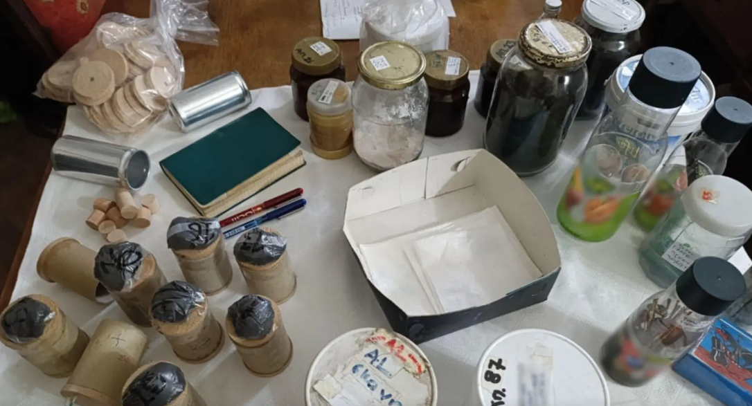 - μεγάλες ποσότητες υλικών που σχετίζονται με την παρασκευή πυρίτιδας, καθώς και πολυάριθμες συσκευασίες που περιείχαν είτε έτοιμη μαύρη πυρίτιδα (πλέον των 13 κιλών), είτε πρόδρομες χημικές ουσίες όπως νιτρικό κάλιο, θείο, ξυλάνθρακα, σκόνες μετάλλων (αλουμινίου, μαγνησίου), υγρά χημικά όπως μεθανόλη, διαιθυλαιθέρας