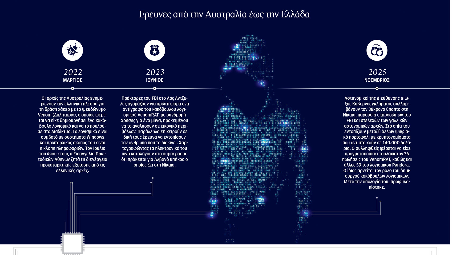 Ο 38χρονος Αλβανός υπήκοος φέρεται να είχε δημιουργήσει και να διακινούσε ένα κακόβουλο λογισμικό με την ονομασία VenomRAT. Σύμφωνα με διεθνείς υπηρεσίες ασφαλείας, το συγκεκριμένο λογισμικό είναι συμβατό με διάφορες εκδόσεις των Windows και πρωταρχικός σκοπός του φέρεται να είναι η κλοπή πληροφοριών. Μπορεί να διεισδύσει σε αρχεία κειμένου αποθηκευμένα στην επιφάνεια εργασίας μολυσμένων υπολογιστών, να παραβιάσει πορτοφόλια κρυπτονομισμάτων, να καταγράψει χτυπήματα πλήκτρων και να αποκτήσει πρόσβαση σε ενσωματωμένες ή συνδεδεμένες κάμερες.