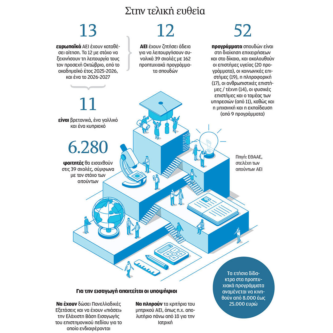 Ειδικότερα, αίτηση έχουν καταθέσει 13 ευρωπαϊκά ΑΕΙ. Τα 12 με στόχο να ξεκινήσουν τη λειτουργία του παραρτήματος τον προσεχή Οκτώβριο και ένα τον Οκτώβριο του 2026. Τα 12 ΑΕΙ στοχεύουν να λειτουργήσουν συνολικά 39 σχολές με 162 προπτυχιακά προγράμματα σπουδών. Μεταξύ των προγραμμάτων, τα περισσότερα (52) είναι στη διοίκηση επιχειρήσεων και στο δίκαιο, και ακολουθούν οι επιστήμες υγείας (20).