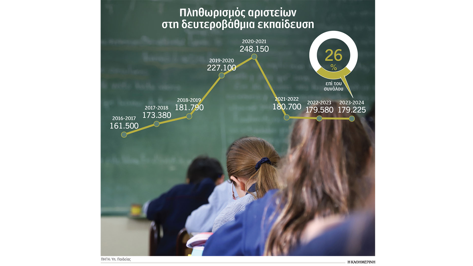 Ειδικότερα, η υπουργός Παιδείας Σοφία Ζαχαράκη, μιλώντας χθες στην «Κ», μίλησε «για «φαινόμενα υπερβαθμολόγησης», όπως αποδεικνύεται και από τον αριθμό των μαθητών που παίρνουν το αριστείο για την επίδοσή τους την προηγούμενη χρονιά. Σύμφωνα με τα στοιχεία του υπουργείου, κατά το σχολικό έτος 2023-2024, οι αριστούχοι μαθητές γυμνασίου – λυκείου ήταν 179.225, σε συνολικά περίπου 680.000 μαθητές. Δηλαδή, το ποσοστό των αριστούχων μαθητών είναι 26% επί του συνόλου. Να σημειωθεί ότι στο γυμνάσιο ένας προαγωγικός ή απολυτήριος βαθμός θεωρείται άριστος όταν είναι πάνω από 18,5, ενώ στο λύκειο πάνω από 18.