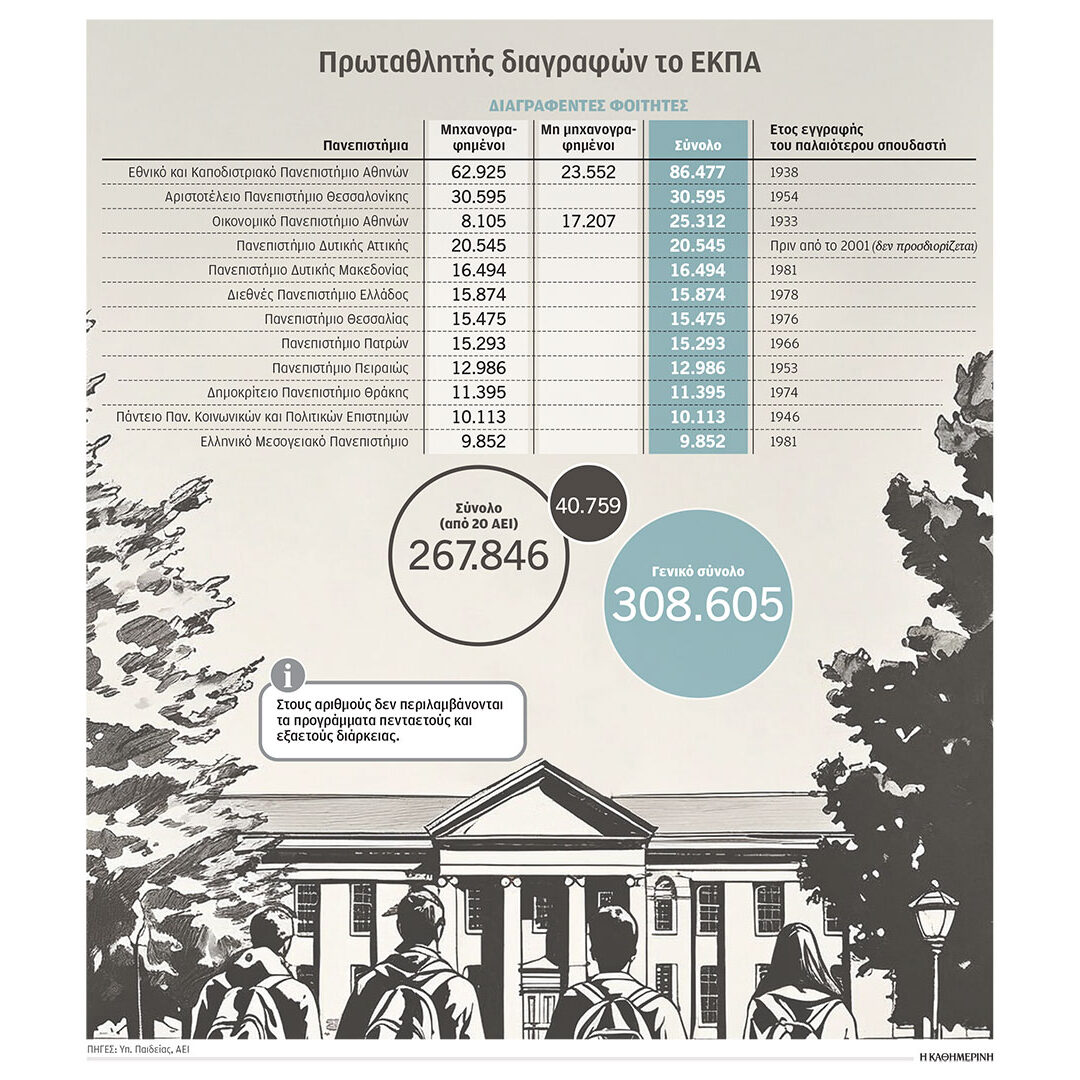 Οπως ανακοίνωσε χθες το υπουργείο Παιδείας, σύμφωνα με τα στοιχεία των ΑΕΙ ο συνολικός αριθμός των μη ενεργών φοιτητών που διεγράφησαν ανήλθε σε 308.605. Στον αριθμό αυτό δεν συμπεριλαμβάνονται τα ΑΕΙ και τα προγράμματα σπουδών πενταετούς και εξαετούς διάρκειας. Πρωταθλητής των διαγραφών, σύμφωνα με τα στοιχεία που παρουσιάζει η «Κ», είναι το Πανεπιστήμιο Αθηνών λόγω μεγέθους και ηλικίας. Μάλιστα, παρά τις διαφωνίες –πολιτικές αλλά και επί των διαδικασιών– που υπήρξαν από πρυτάνεις, πανεπιστημιακούς και φοιτητικές παρατάξεις για την απόφαση των διαγραφών, έως τώρα δεν κατεγράφησαν δυναμικές αντιδράσεις.