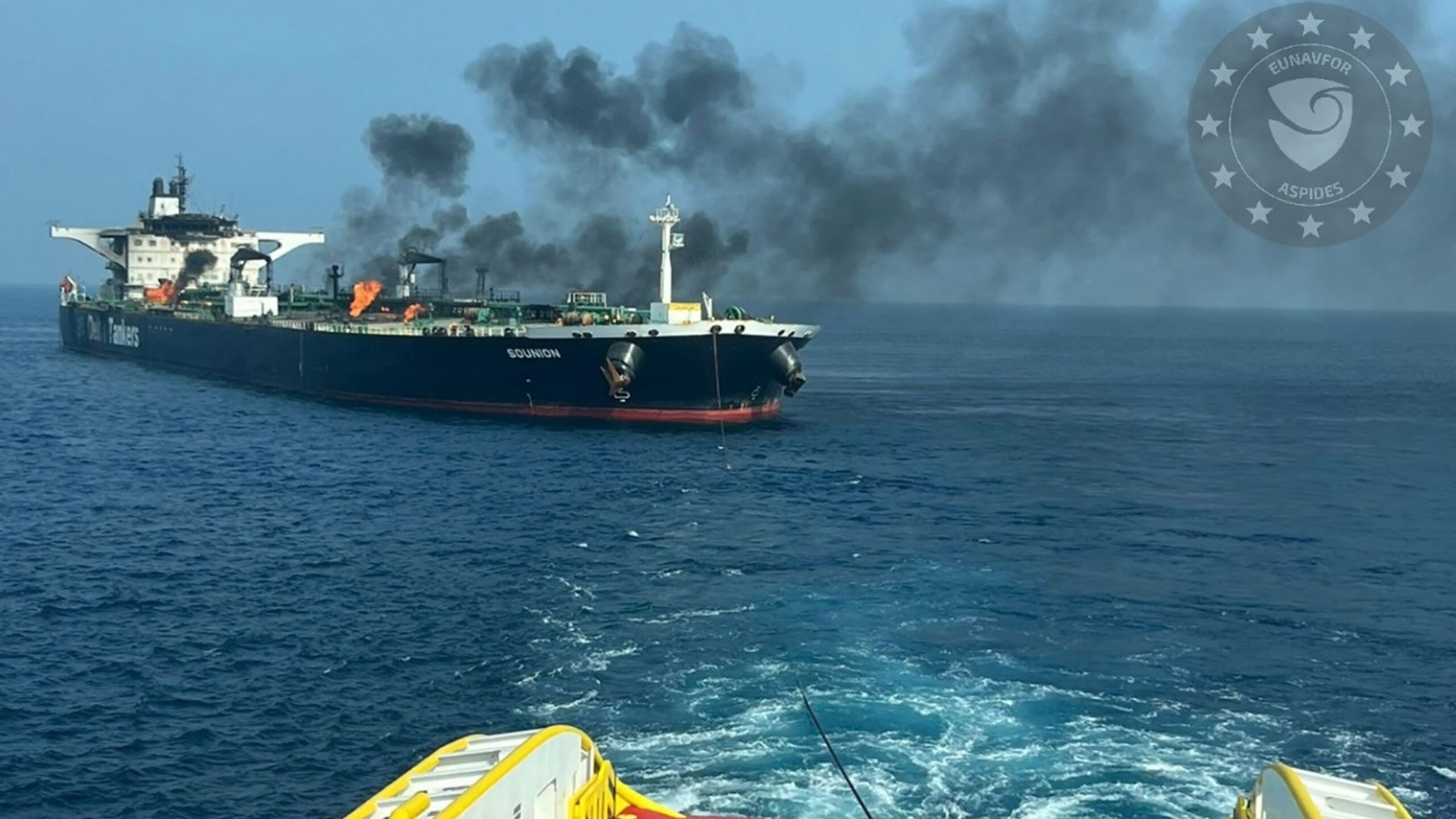 Σε ασφαλές σημείο αγκυροβόλησης προς τα βόρεια της Ερυθράς Θάλασσας ρυμουλκείται με αργή ταχύτητα και ασφάλεια από το ελληνικό ναυαγοσωστικό «Aigaion Pelagos» το ελληνόκτητο τάνκερ «Sounion» της Delta tankers, που μεταφέρει 150.000 τόνους πετρελαίου.