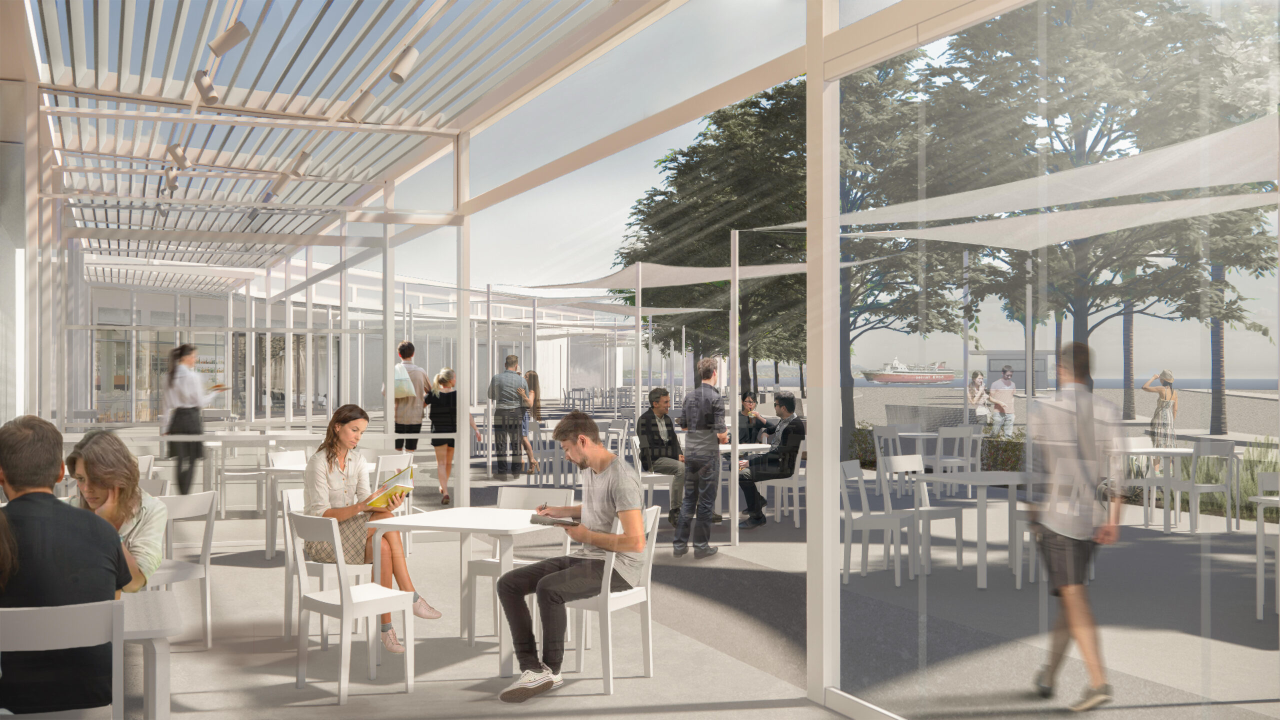 Η νέα δομή θα είναι μια ελαφριά μεταλλική κατασκευή με ναυτικές αναφορές, στο λευκό χρώμα, στα ιστία των ιστιοπλοϊκών σκαφών και θα λειτουργεί ως ένα ελαφρύ, «διάφανο» στέγαστρο, μπροστά από το υπάρχον κτιριακό συγκρότημα. Η κάθε μονάδα στεγάστρου θα μπορεί να μεταβάλλεται από εντελώς ανοιχτή έως εντελώς κλειστή, ανάλογα με τις περιβαλλοντικές συνθήκες, μέσα από σύστημα περιστρεφόμενων μεταλλικών περσίδων, σύστημα αναδιπλούμενων γυάλινων πετασμάτων και ανασυρόμενων τηλεσκοπικών κουφωμάτων.