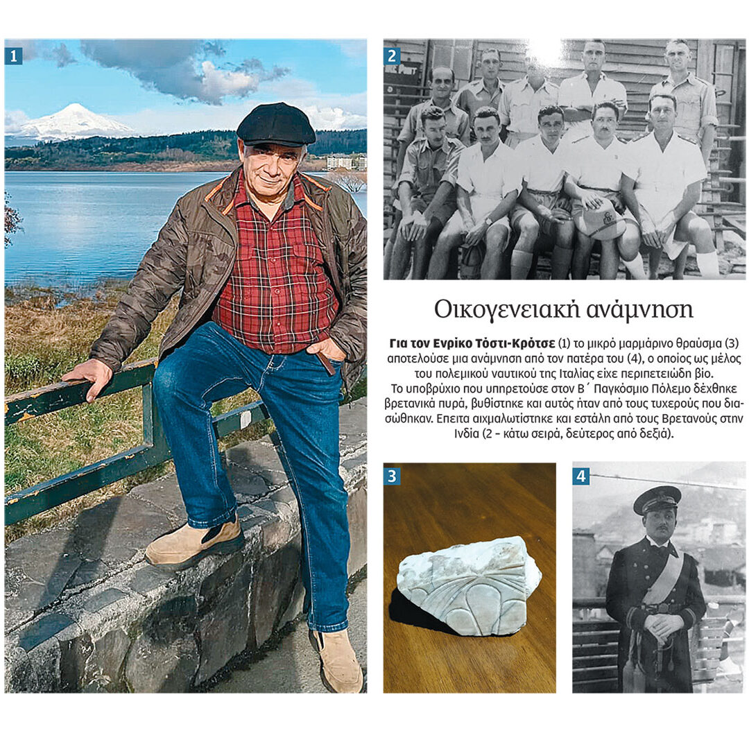Από τότε που θυμάται τον εαυτό του, το αρχαίο μαρμάρινο θραύσμα κατείχε περίοπτη θέση στο σαλόνι του σπιτιού τους, στη Χιλή. Ηταν μικρό, διαστάσεων μόλις 8,2 επί 11,4 εκατοστών, αλλά κουβαλούσε μια μεγάλη ιστορία. «Ο πατέρας μου ήταν μέλος του πολεμικού ναυτικού της Ιταλίας, ταξίδευε πολύ στη Μεσόγειο και τη δεκαετία του 1930 είχε επισκεφθεί την Αθήνα», θυμάται ο Ενρίκο Τόστι-Κρότσε. «Ανέβηκε στην Ακρόπολη σε εκείνο το ταξίδι και πήρε μαζί του αυτό το κομμάτι ως ενθύμιο. Μου έλεγε ότι ήταν από τον Παρθενώνα».