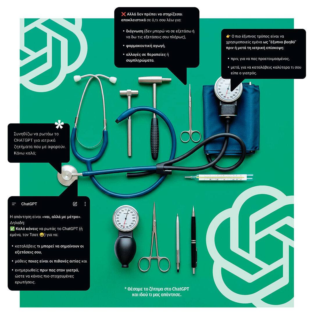 Σήμερα έπιασα κουβέντα με το ChatGPT. «Πόσο μπορώ να σε εμπιστεύομαι για ιατρικά θέματα;», το ρώτησα. «Μπορώ να εξηγήσω ιατρικούς όρους, διαδικασίες, συμπτώματα ή διατροφικά θέματα, να δώσω πληροφορίες για υγιεινή διατροφή, άσκηση, ψυχική υγεία, προληπτικές εξετάσεις, καθώς και οδηγίες για αναζήτηση βοήθειας. Δεν μπορώ να εξετάσω φυσικά ή να βγάλω ασφαλή διάγνωση, να δώσω ιατρική συμβουλή ή να σου πω ποια φαρμακευτική αγωγή είναι κατάλληλη. Δεν μπορώ να αντικαταστήσω γιατρό, διατροφολόγο ή ψυχολόγο», μου απάντησε. Στη συνέχεια, θέλοντας να διαπιστώσω των λόγων του το ασφαλές, του ανέφερα κάποια ανησυχητικά συμπτώματα που με ταλαιπωρούν εδώ και εβδομάδες: ενόχληση στη μέση, μαζί με οξύ πόνο και μούδιασμα στον αριστερό μηρό. Το ChatGPT, μέσα σε λίγα δευτερόλεπτα, έκανε τις πιθανές διαγνώσεις –από πίεση νεύρου στην οσφυϊκή μοίρα της σπονδυλικής στήλης και περιφερική νευροπάθεια μέχρι σακχαρώδη διαβήτη και αρτηριοπάθεια– και μου πρότεινε μια σειρά από φαρμακευτικές ουσίες που ενδείκνυνται για την περίπτωσή μου: μη στεροειδή αντιφλεγμονώδη, όπως ιβουπροφαίνη και ναπροξένη (για τον πόνο και τη φλεγμονή), μυοχαλαρωτικά (αν υπάρχει σπασμός στη μέση) αλλά και γαβαπεντίνη, πρεγκαμπαλίνη ή ντουλοξετίνη (για το νευροπαθητικό άλγος).