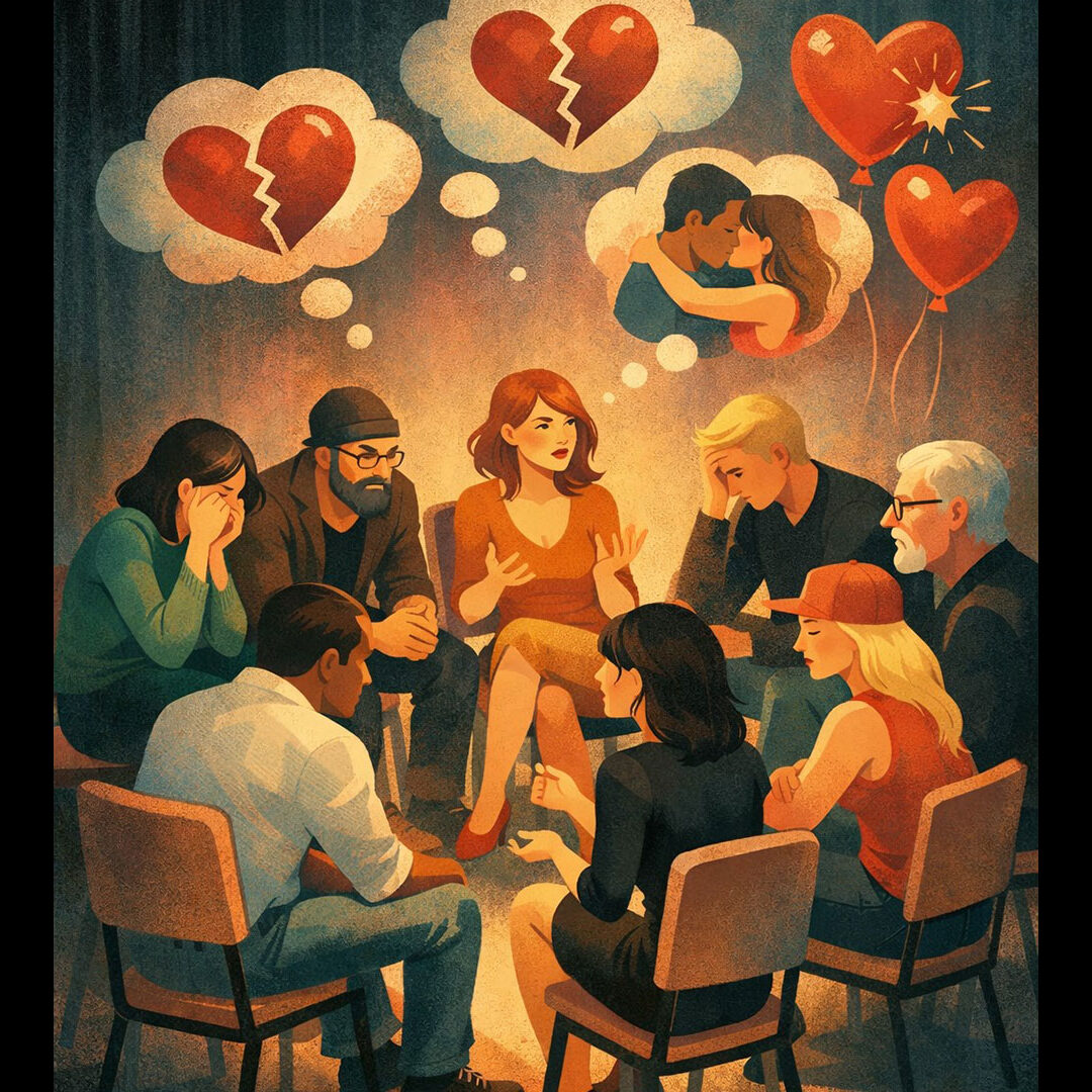 Ο Τζ., ο οποίος θεωρεί ότι ενώ ερωτεύεται συχνά στην πραγματικότητα δεν έχει υπάρξει ποτέ συναισθηματικά ευάλωτος, θέλει να απεξαρτηθεί από την αγάπη για να μπορέσει να συνάψει υγιή σχέση με μια συγκεκριμένη γυναίκα. O N. παρομοιάζει τον εθισμό του με τον τζόγο – πίστευε ότι κάθε ζαριά, κάθε ακόμη προσπάθεια στην τοξική του σχέση, θα ήταν διαφορετική κι έπαιζε πάλι, κι όταν εντέλει χώρισε, θεωρούσε ότι δεν θα αγαπηθεί ποτέ ξανά. Η Σ. προσπαθεί να μην «κολλάει» με ανθρώπους και να μη δημιουργεί φαντασιώσεις μαζί τους, για να είναι πιο παρούσα στον γάμο της. «Είμαι ΑΑ», δηλώνει, «αλλά η συναισθηματική απεξάρτηση είναι πιο δύσκολη από την απεξάρτηση από το αλκοόλ». Το ‘χει γράψει άλλωστε και ο Καναδός φιλόσοφος Ματσόνα Ντελιγούεγιο. «Το πιο σπουδαίο ναρκωτικό είναι η αγάπη».