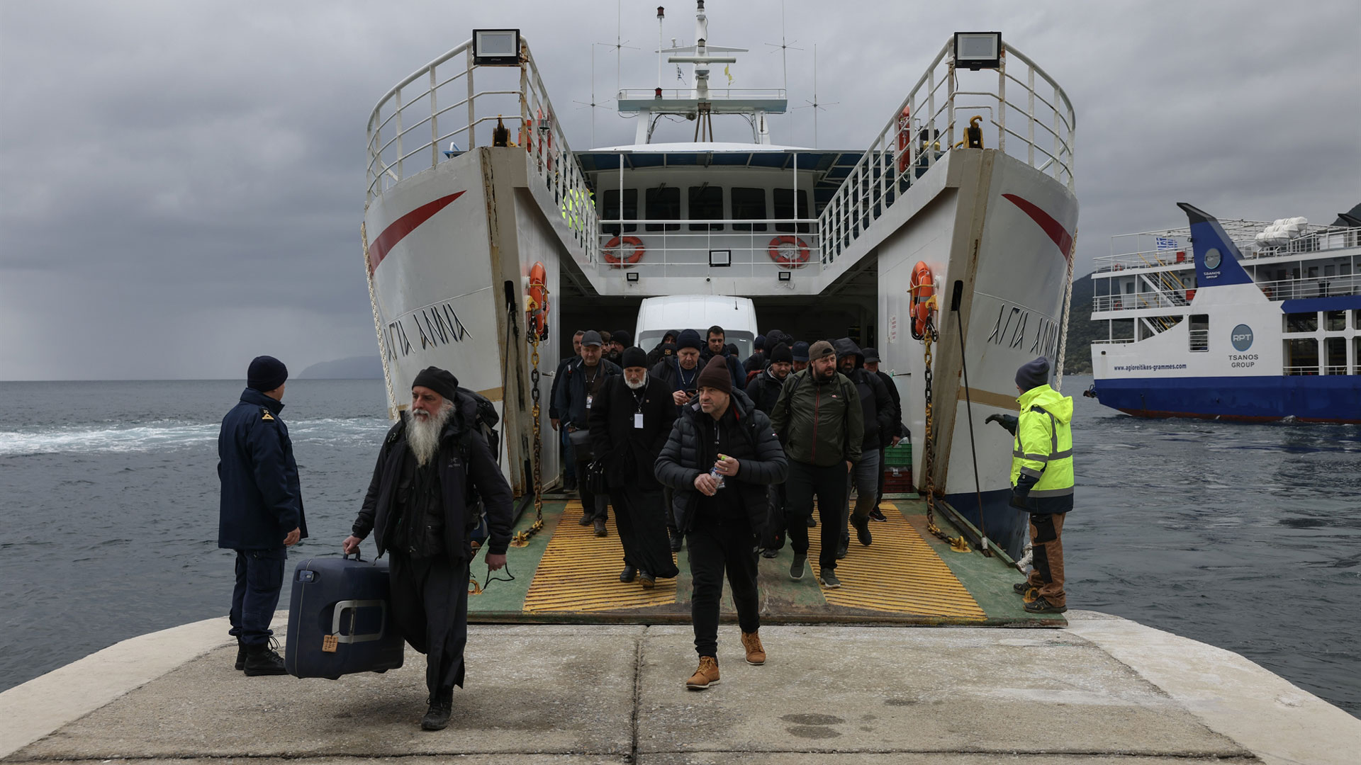 «Είναι η δεύτερη φορά που επισκέπτομαι το Αγιον Ορος. Είμαστε μια μεγάλη παρέα από την πόλη Μπρασόβ», λέει ο Γιάνκο, ένας νεαρός Ρουμάνος. Η παρέα βγάζει μια αναμνηστική φωτογραφία στο σαλόνι του πλοίου. Είναι ευσεβείς, οι περισσότεροι νέοι, ορισμένοι κρατούν χάρτες και φορούν ορειβατικά ρούχα. Εχει πια χαράξει, όμως πέφτει ένα επίμονο ψιλόβροχο και η θάλασσα είναι μολυβένια.