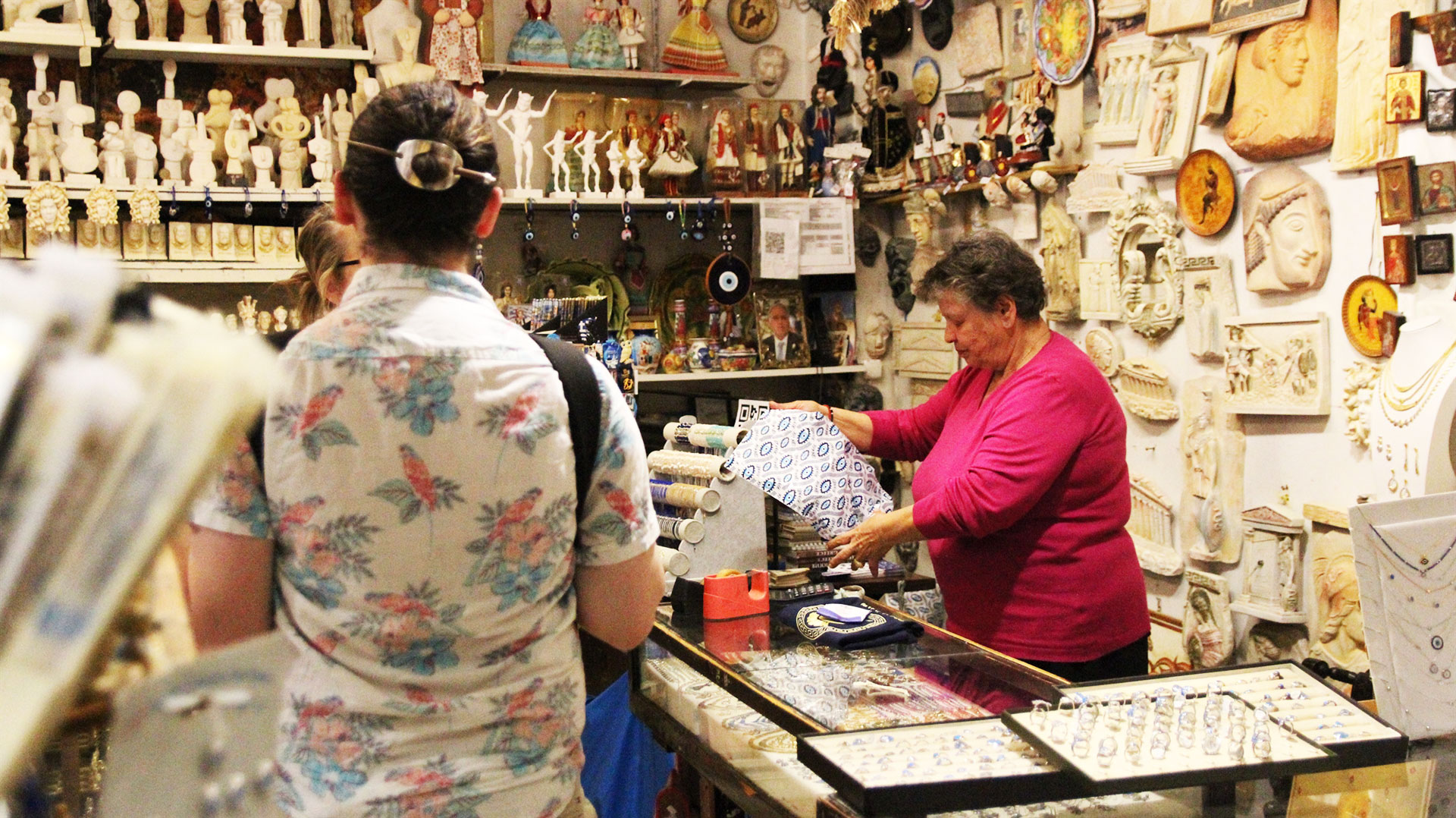 «Δεν έχει δουλειά. Πόλεμος, ανασφάλεια, ο κόσμος δεν είναι άνετος οικονομικά. Το μαγαζί έχει 200 ευρώ έξοδα την ημέρα. Η ώρα είναι μία το μεσημέρι και δεν έχω κάνει ούτε σεφτέ. Ενα χρόνο το πολύ να δουλέψω ακόμα», λέει απογοητευμένη η Ανδρομάχη Διπλαρίδη, που βρίσκεται στην Πλάκα 48 ολόκληρα χρόνια. Στον δικό της δρόμο, όπως λέει, επικρατεί μεγάλη ανησυχία. «Είναι όλοι οι καταστηματάρχες χρεωμένοι», αναφέρει. Ενώ μας μιλάει, τρεις τουρίστες μπαίνουν στο κατάστημα. «Ηρθαμε στην Ελλάδα για ένα εκπαιδευτικό ταξίδι με 22 μαθητές μου, ηλικίας 14 έως 18 ετών. Πήγαμε στο Τολό, στην Ολυμπία, στην Επίδαυρο, στις Μυκήνες και στους Δελφούς», εξηγεί ο 26χρονος Τσέις Κόστον, καθηγητής Θεάτρου στη Νότια Καρολίνα, καθώς περιηγείται στο κατάστημα της κ. Διπλαρίδη, και στέκεται στη βιτρίνα με τις κεραμικές μάσκες αρχαίας τραγωδίας. Οι μαθητές του ανέβασαν στο σχολείο μια διασκευή της «Μήδειας» του Ευριπίδη, η οποία εκτυλίσσεται στην Κόρινθο. «Οταν πήγαμε στην Αρχαία Κόρινθο και περπατούσαμε ανάμεσα στα αρχαία, αισθανθήκαμε πως οι χαρακτήρες που υποδυόμασταν ζωντανεύουν έπειτα από χιλιάδες χρόνια. Ηταν απίστευτο», σημειώνει.