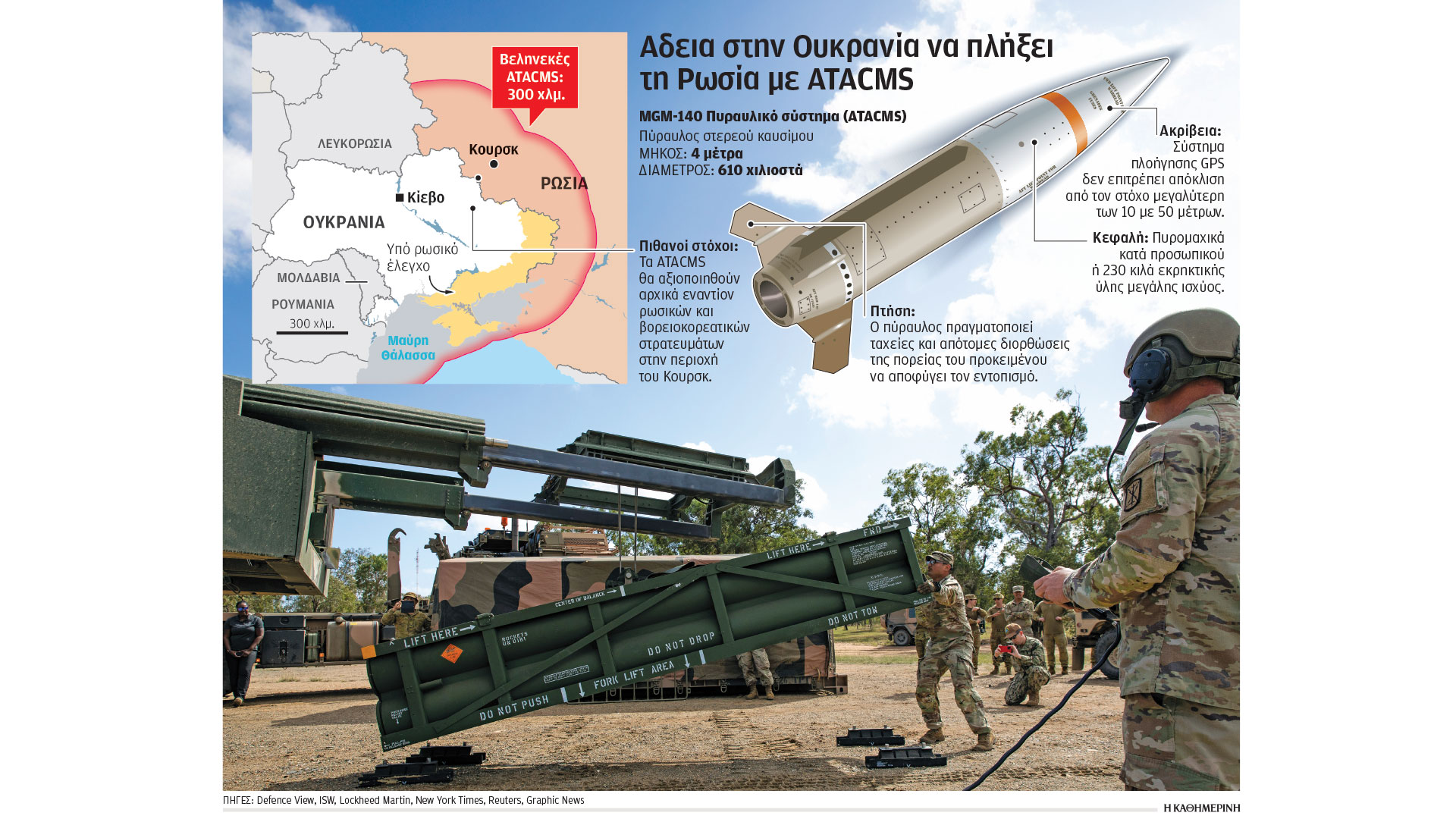 Εντυπη έκδοση. Την έντονη αντίδραση της ρωσικής πολιτικής ηγεσίας προκάλεσε η απόφαση του Αμερικανού προέδρου Τζο Μπάιντεν να εγκρίνει τελικά, με καθυστέρηση πολλών μηνών, το αίτημα των Ουκρανών να χρησιμοποιήσουν αμερικανικούς πυραύλους ATACMS για πλήγματα σε μεγάλο βάθος της ρωσικής επικράτειας. «Είναι προφανές ότι η απερχόμενη διοίκηση στην Ουάσιγκτον… ρίχνει κι άλλο λάδι στη φωτιά, προκαλώντας περαιτέρω κλιμάκωση των εντάσεων», σχολίασε ο εκπρόσωπος Τύπου του Κρεμλίνου, Ντμίτρι Πεσκόφ. Ο Ρώσος αξιωματούχος υπενθύμισε ότι στις 12 Σεπτεμβρίου ο πρόεδρος Βλαντιμίρ Πούτιν είχε προειδοποιήσει ότι μια παρόμοια απόφαση της Ουάσιγκτον θα άλλαζε ριζικά τον χαρακτήρα του πολέμου, καθώς θα σήμαινε ότι οι ΗΠΑ και άλλες χώρες-μέλη του ΝΑΤΟ συμμετέχουν πλέον ευθέως στη στρατιωτική σύγκρουση εναντίον της Ρωσίας. Αιτιολογώντας τη θέση του ο Πούτιν είχε τότε υποστηρίξει ότι η χρήση των ATACMS για πλήγματα σε μεγάλο βάθος της ρωσικής επικράτειας προϋποθέτει την άμεση ανάμειξη της Δύσης μέσω στρατιωτικών ειδικών και πληροφοριών δορυφορικής κατασκοπείας.