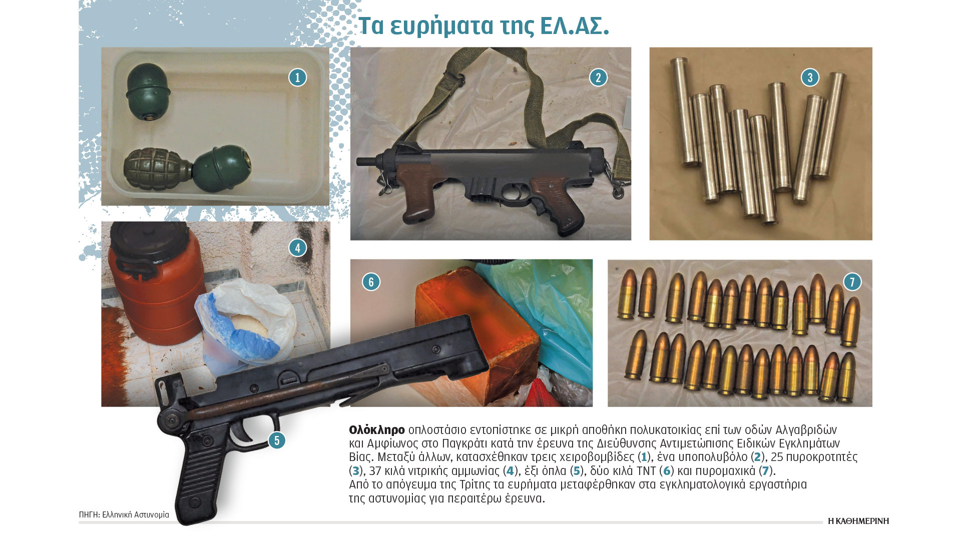 Πρόκειται για μικρή αποθήκη πολυκατοικίας επί των οδών Αλγαβριδών και Αμφίωνος, μέσα στην οποία βρέθηκαν εκρηκτικά, όπλα, χειροβομβίδες, αλλά και ένας φορητός ηλεκτρονικός υπολογιστής. Ηδη από το απόγευμα της Τρίτης τα ευρήματα μεταφέρθηκαν στα εγκληματολογικά εργαστήρια της αστυνομίας για περαιτέρω έρευνα, ενώ συνεργεία της σήμανσης ερεύνησαν το εσωτερικό της αποθήκης για δακτυλικά αποτυπώματα και DNA.