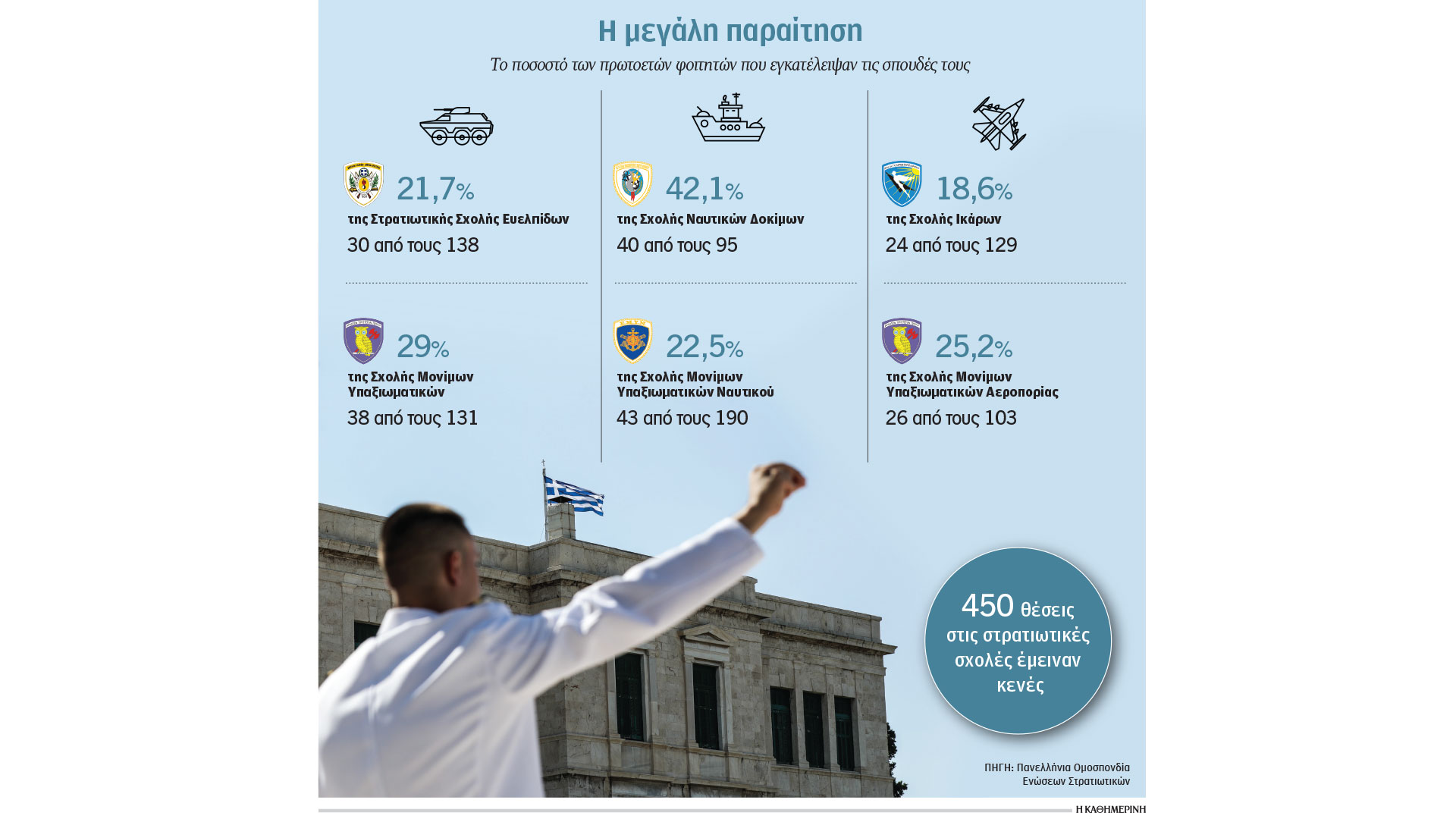 • 30 πρωτοετείς σπουδαστές της Σχολής Ευελπίδων (ΣΣΕ) από σύνολο 138 εισακτέων όλων των κατηγοριών, καθώς και 8 δευτεροετείς. Το ποσοστό παραιτηθέντων πρωτοετών είναι μέχρι στιγμής 21,7%.